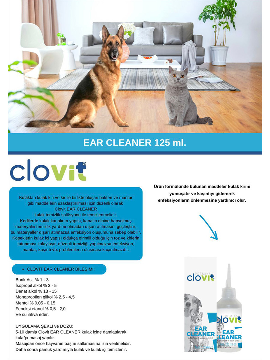 Clovit Kulak ve Göz Temizleme Bakım Seti, evcil hayvanların günlük bakımını desteklemek amacıyla geliştirilmiş kulak ve göz temizlik solüsyonlarından oluşan 2’li settir. Düzenli kullanımda kulak ve göz çevresinin nazikçe temizlenmesine yardımcı olur. Set İçeriği: 1 adet Clovit Ear Cleaner – 125 ml, 1 adet Clovit Eye Cleaner – 125 ml. UYGULAMA ŞEKLİ ve DOZU: 5-10 damla Clovit EAR CLEANER kulak içine damlatılarak kulağa masaj yapılır. Masajdan önce hayvanın başını sallamasına izin verilmelidir. Daha sonra pamuk yardımıyla kulak ve kulak içi temizlenir. UYGULAMA ŞEKLİ ve DOZU: Hayvanın gözüne 3 damla Clovit EYE CLEANER damlatılır ve hayvanın gözünü açıp kapamasına izin verilir. Göz çevresi pamuk yardımıyla temizlenir. Haftada 1-2 defa ya da ihtiyaç duyuldukça işlem tekrarlanır. CLOVIT EAR CLEANER BİLEŞİMİ: Borik Asit % 1 - 3, İsopropil alkol % 3 - 5, Denat alkol % 13 - 15, Monopropilen glikol % 2,5 - 4,5, Mentol % 0,05 - 0,15, Fenoksi etanol % 0,5 - 2,0 ve su ihtiva eder. CLOVIT EYE CLEANER BİLEŞİMİ: Borik Asit % 0,4 - 1,3, Sodyum Klorür % 0,2 - 0,6, Çinko Sülfat % 0,20 - 0,45, BAC 50 % 0,1 - 0,3 ve su ihtiva eder.
