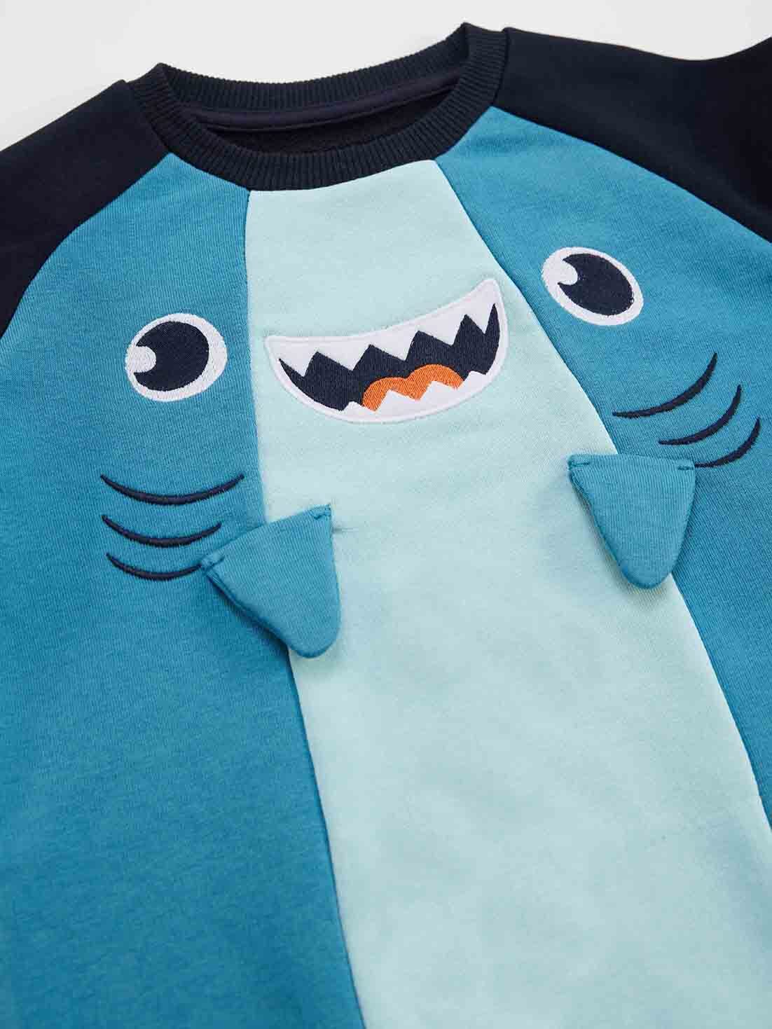 2'li eşofman takım. Kalın pamuklu kumaştan, gövdesi köpekbalığı şeklinde tasarlanmış, nakış ve aplikeli eşofman üstü. Takımın tamamlayıcısı kalın pamuklu kumaştan, 2 yanı şerit detaylı eşofman altı. Beli ve bilekleri lastiklidir. Tüm Denokids ürünleri çocuk güvenliği düşünülerek üretilmiştir ve iğne dedektörlerinden geçirilmiştir. Üst: %66 Pamuk %34 Polyester - Alt: %66 Pamuk %34 Polyester