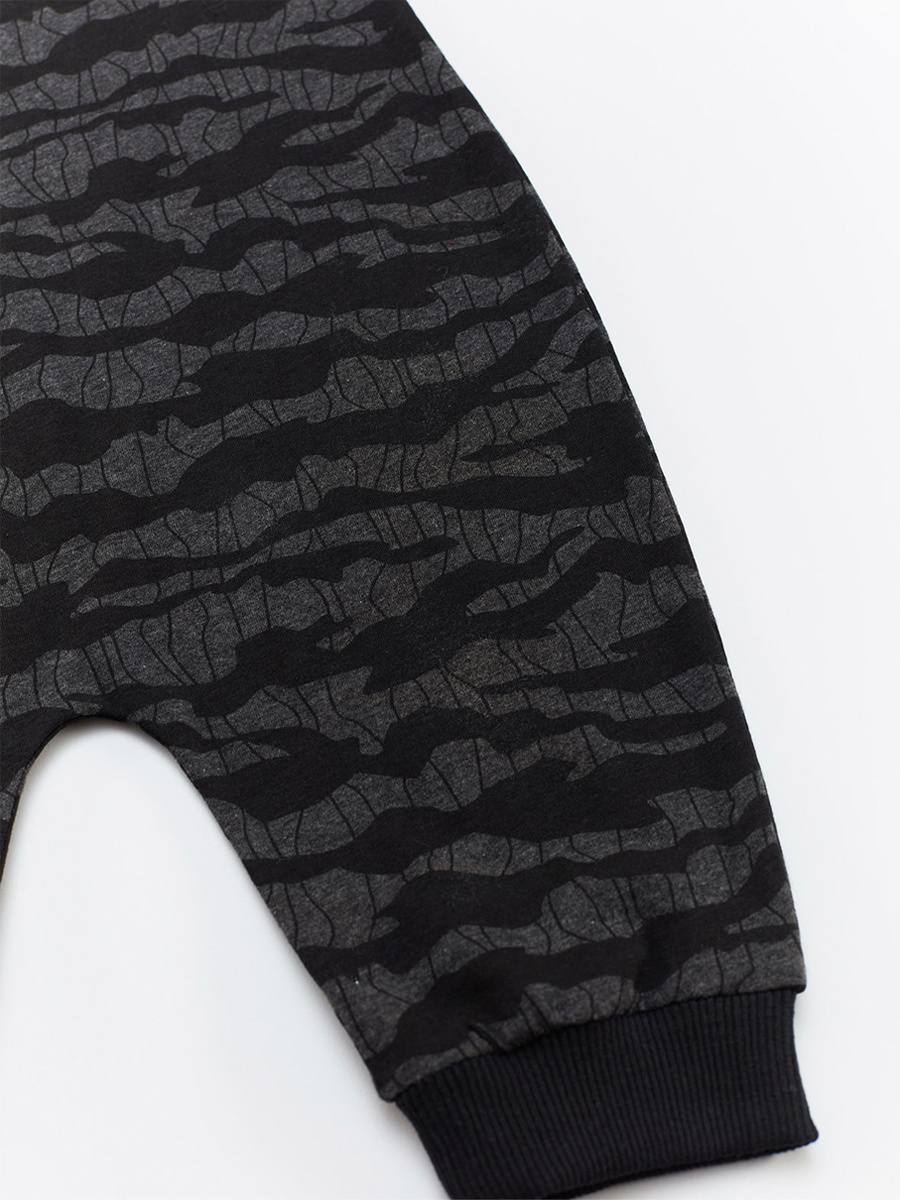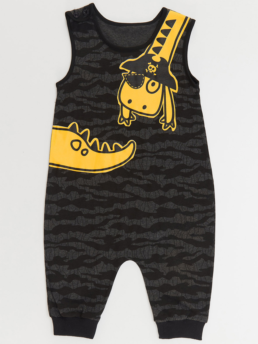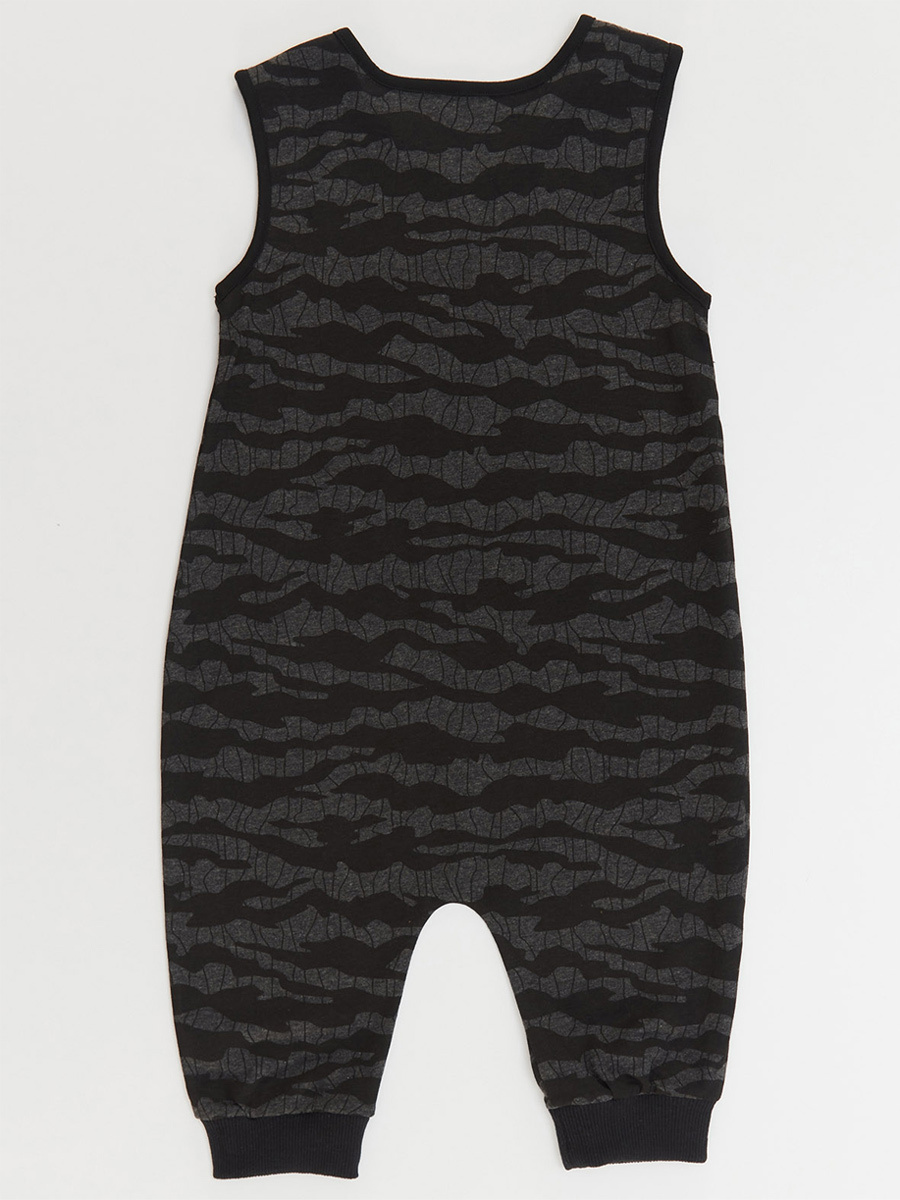 Kamuflaj desenli, pamuklu penye kumaştan, üzeri dinozor baskılı, düşük ağ kesimli rahat tulum. Omuzundaki düğmeler sayesinde kolayca giyilip çıkarılabilir.