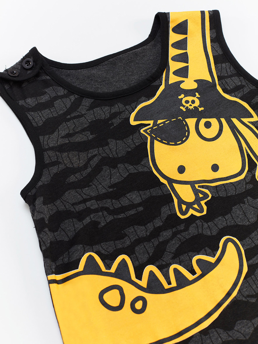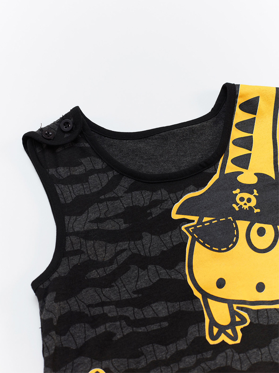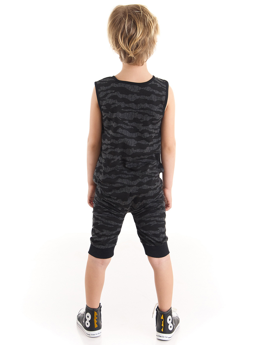 Kamuflaj desenli, pamuklu penye kumaştan, üzeri dinozor baskılı, düşük ağ kesimli rahat tulum. Omuzundaki düğmeler sayesinde kolayca giyilip çıkarılabilir.