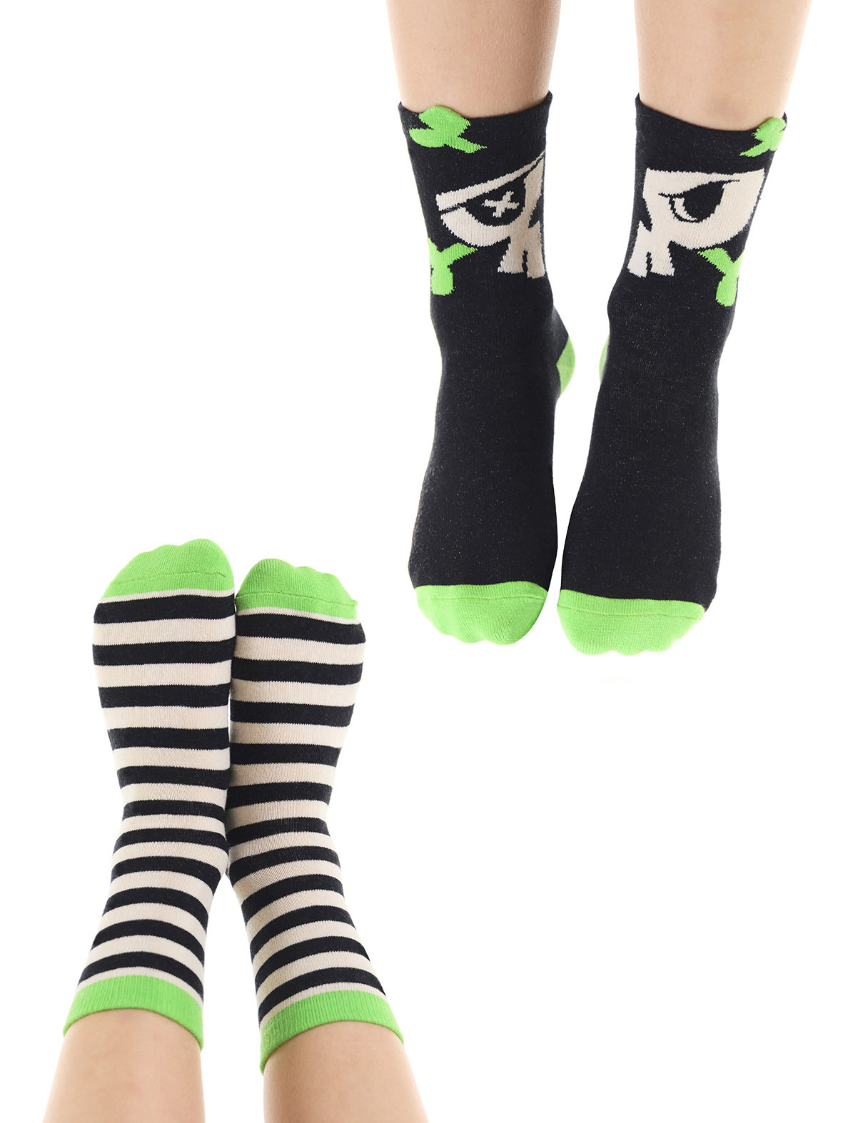 Erkek çocuk 2 çift, korsan kurukafa desenli çorap. Küçük ayakların rahatı düşünülerek yumuşak pamuk ile örülmüştür. %80 Pamuk % 18 Poliamid %2 Elastan