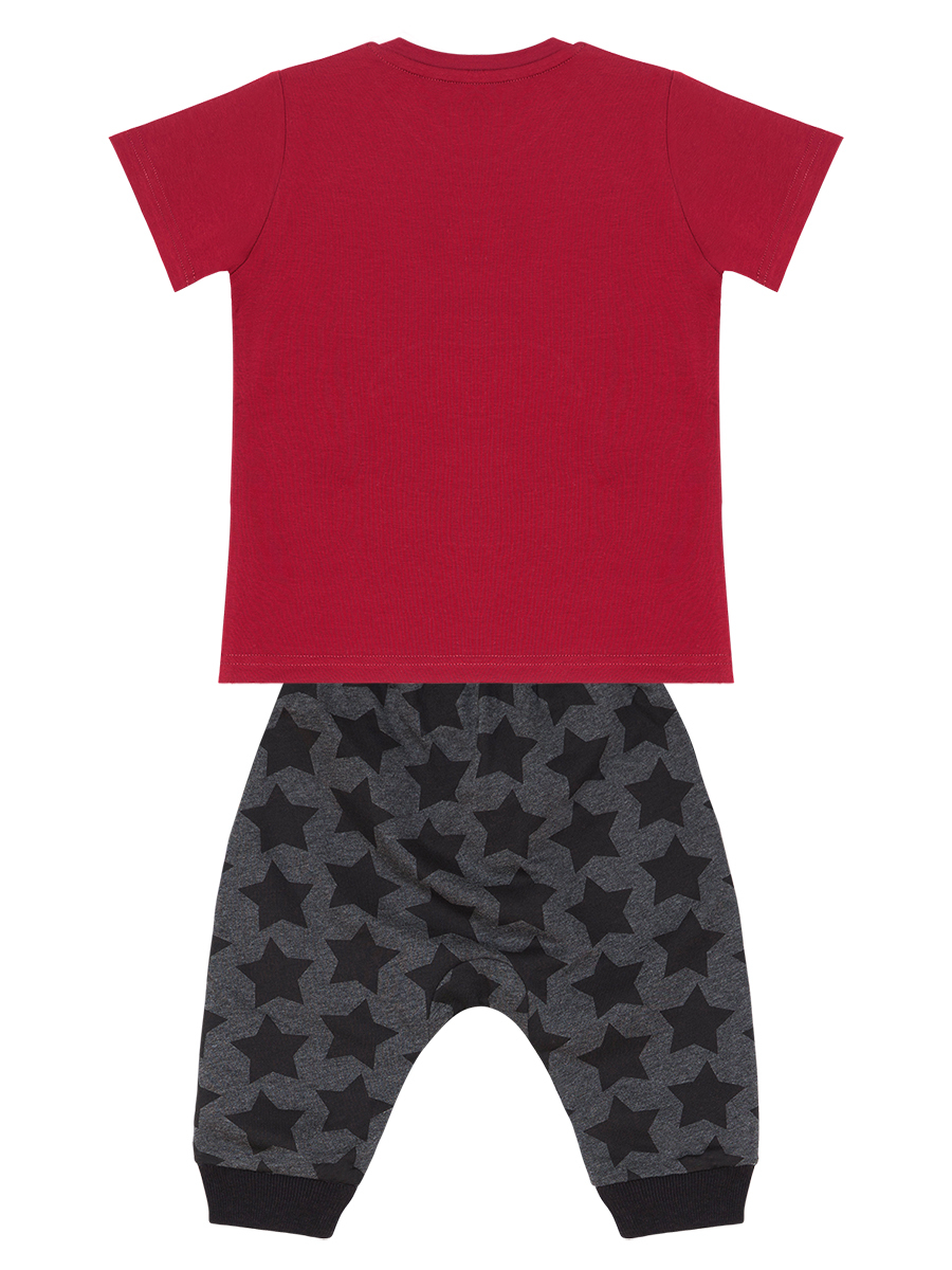 2 parça erkek çocuk t-shirt ve kapri boy pamuklu pantolon takım. Pamuklu penye kumaştan, üzeri korsan baskılı, ve şapka aplikeli kısa kol t-shirt. Takımın tamamlayıcısı pamuklu penye kumaştan, düşük ağ kesimli, rahat, yanları cepli kapri. Beli hem lastik hem de kordonludur. Bu ürün Avrupa standartlarında "Çocuk Güvenliği Kuralları"na uygun olarak üretilmiştir. İğne dedektörlerinden geçirilmiştir.