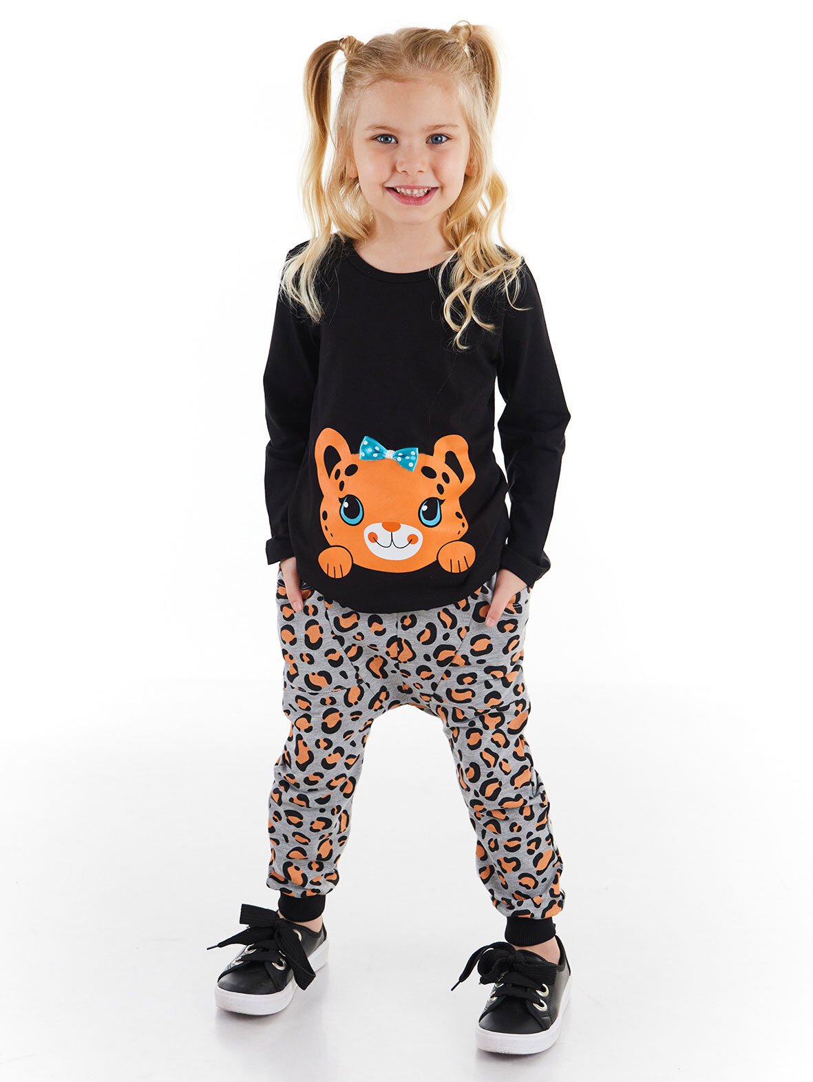 2'li takım. Pamuklu penye kumaştan üzeri leopar baskılı, uzun kollu t-shirt. Takımın tamamlayıcısı orta kalın pamuklu kumaştan eşofman altı. Eşofman altı düşük ağ kesimli ve oldukça rahattır. Beli kordonlu ve bilekleri lastiklidir.