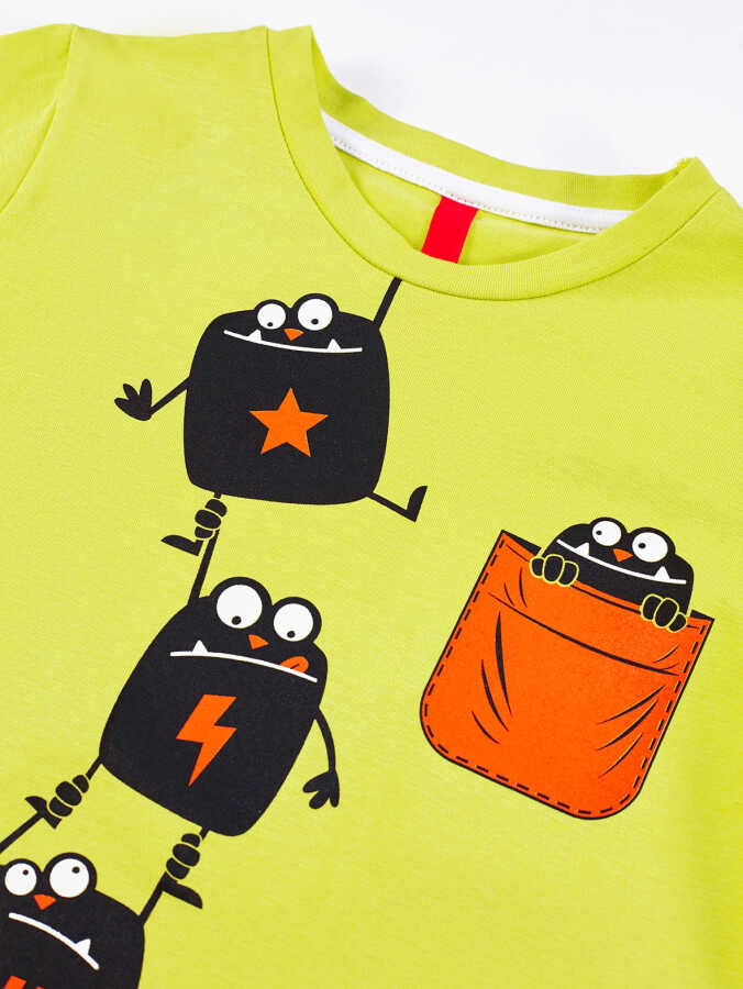 2 parçalı erkek çocuk takım. Canavar baskılı t-shirt ve pamuklu kumaştan bir paçası baskılı siyah şort. Alt, Üst: %92 pamuk %8 elastan