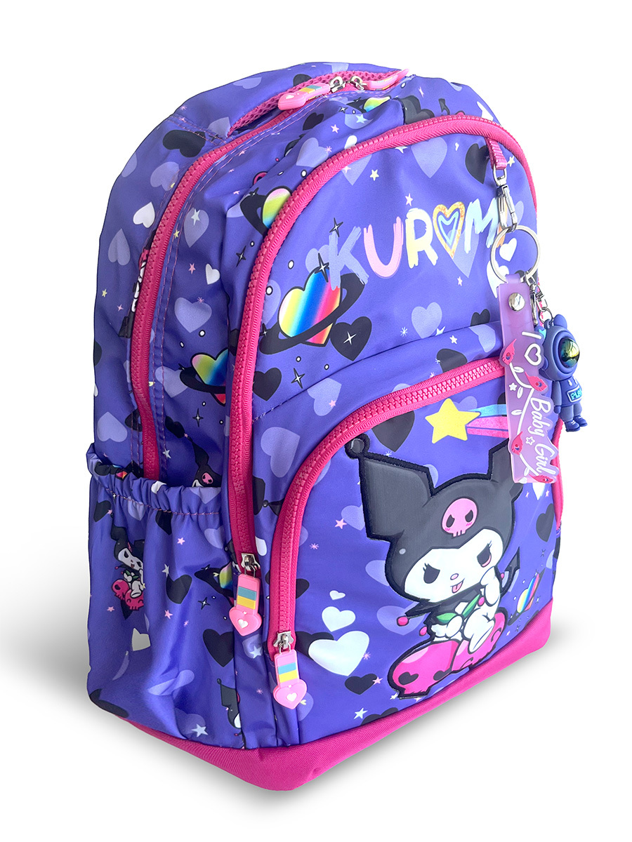 Sevimli Kuromi karakteri ile tasarlanan bu 3’lü okul seti; okul çantası, beslenme çantası ve kalemlikten oluşur. Mor ve pembe renkleriyle dikkat çeken set, hem şık hem de kullanışlı yapısıyla çocukların okul hayatını kolaylaştırır. Ergonomik sırt desteği ve ayarlanabilir askıları sayesinde rahat taşıma imkanı sunarken, dayanıklı kumaşı uzun süreli kullanım sağlar. Geniş iç hacimli okul çantası, pratik beslenme çantası ve düzenli kalemlik ile çocukların tüm ihtiyaçlarını tek set içinde karşılar.