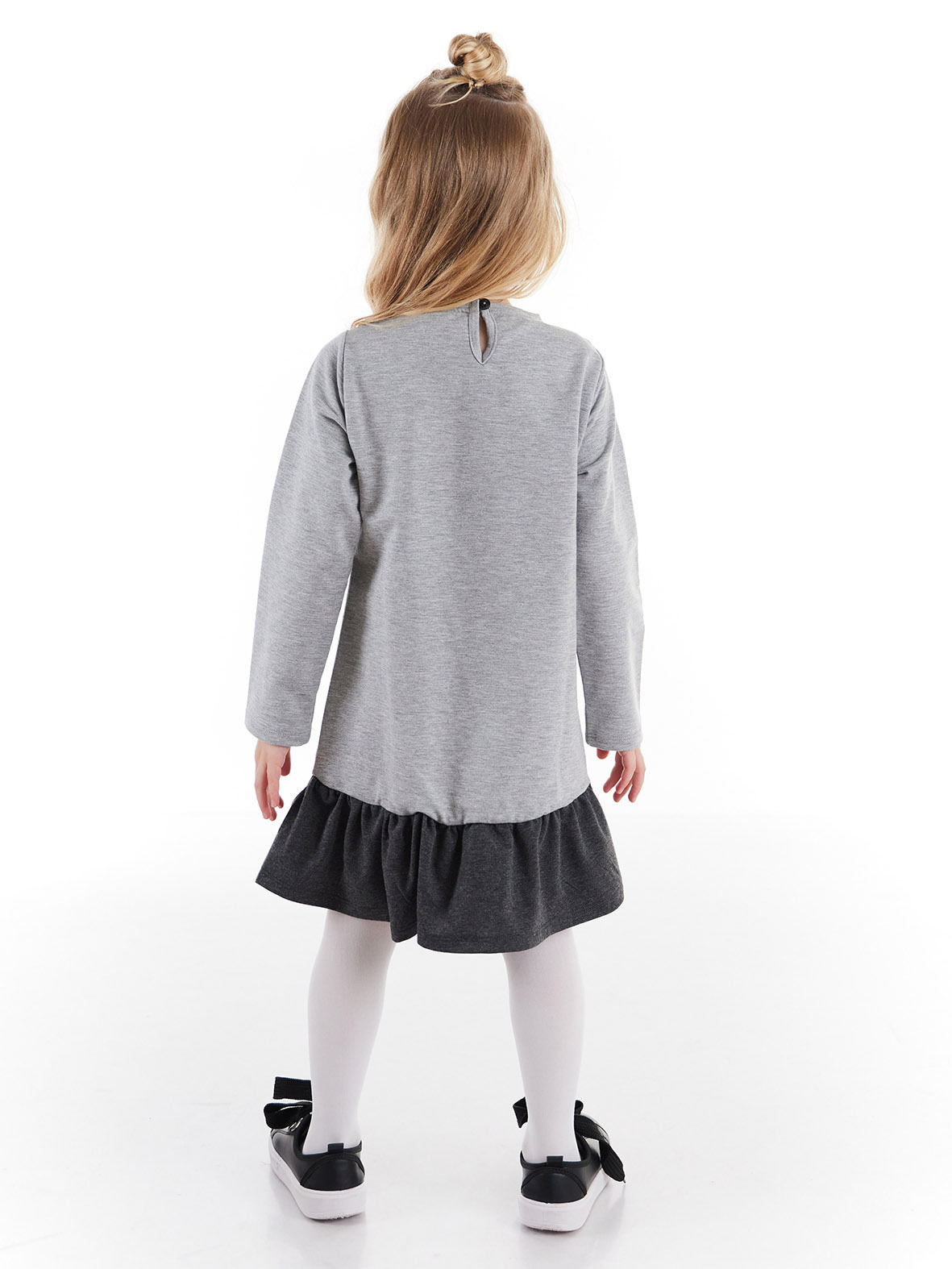 Pamuklu kumaştan üretilmiş,Önü Kedi baskılı ve eteği fırfırlı elbise. %65 pamuk %35 Polyester
