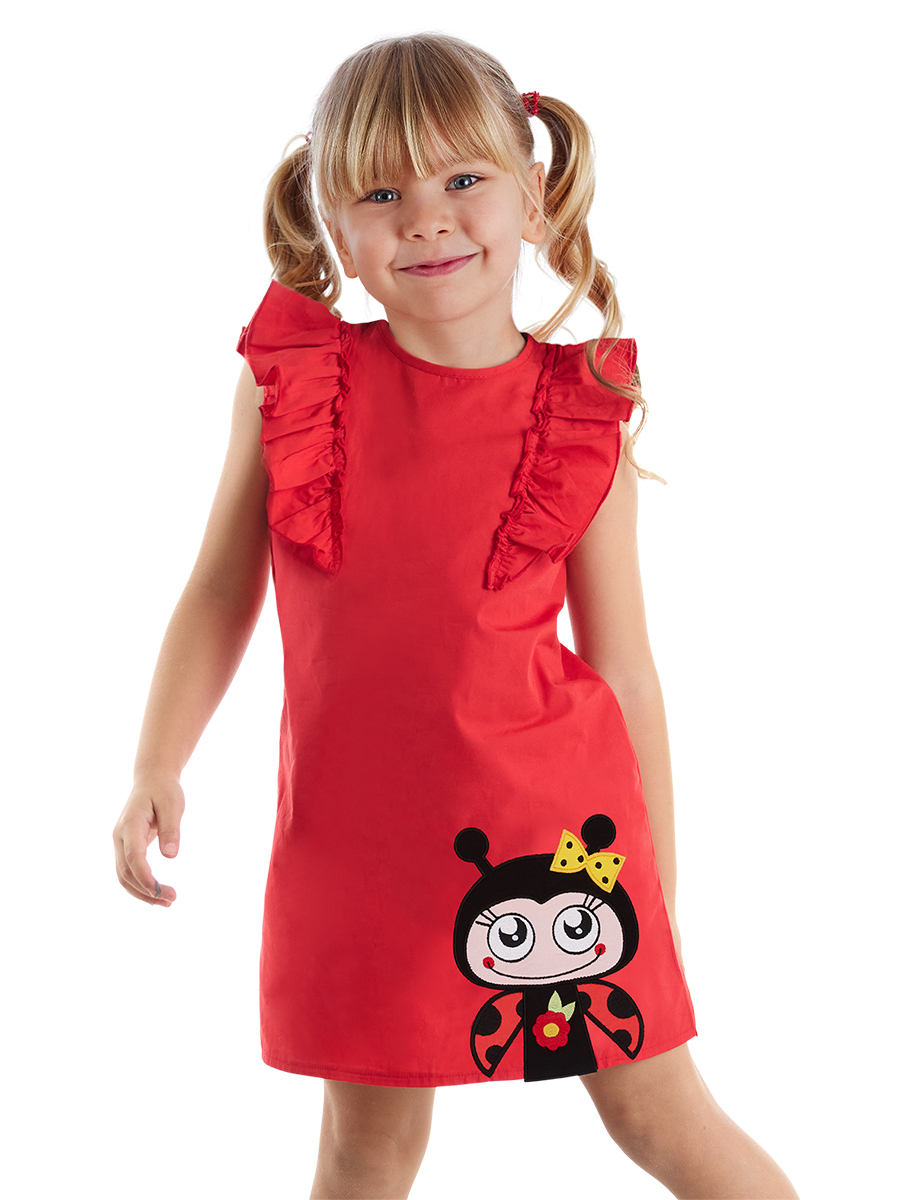 Poplin girl dress with ladybug applique on. Ruffles from shoulders till chest. 100% Cotton