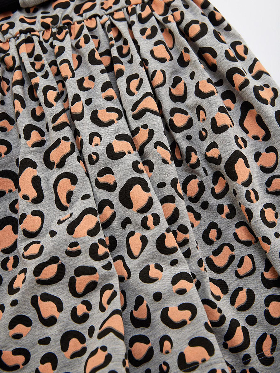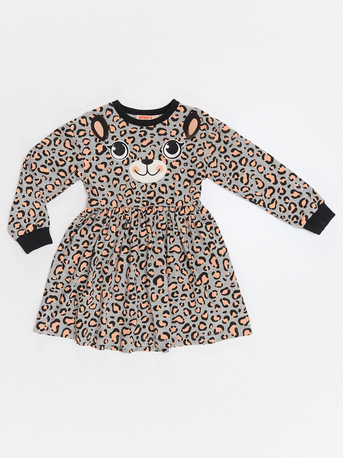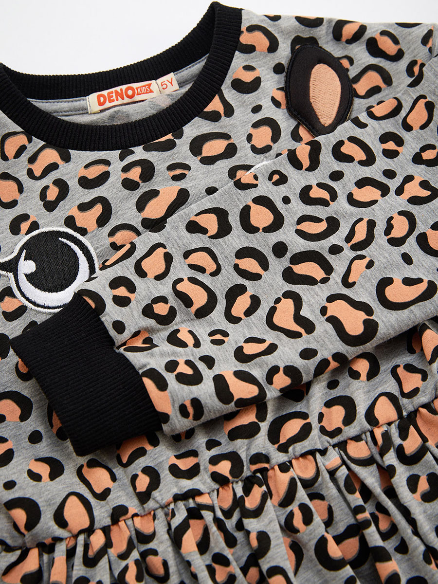 Orta kalın, pamuklu penye kumaştan önü leopar yüzü aplikeli, kız çocuk elbise. Leoparın kulakları bedene 3 boyutlu olarak tutturulmuştur.Tüm Denokids ürünleri çocuk güvenliği düşünülerek üretilmiştir ve iğne dedektörlerinden geçirilmiştir.