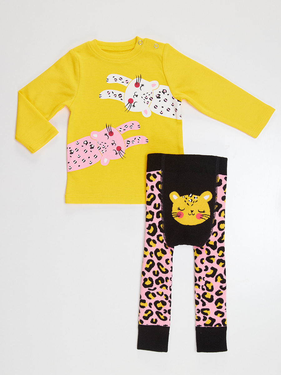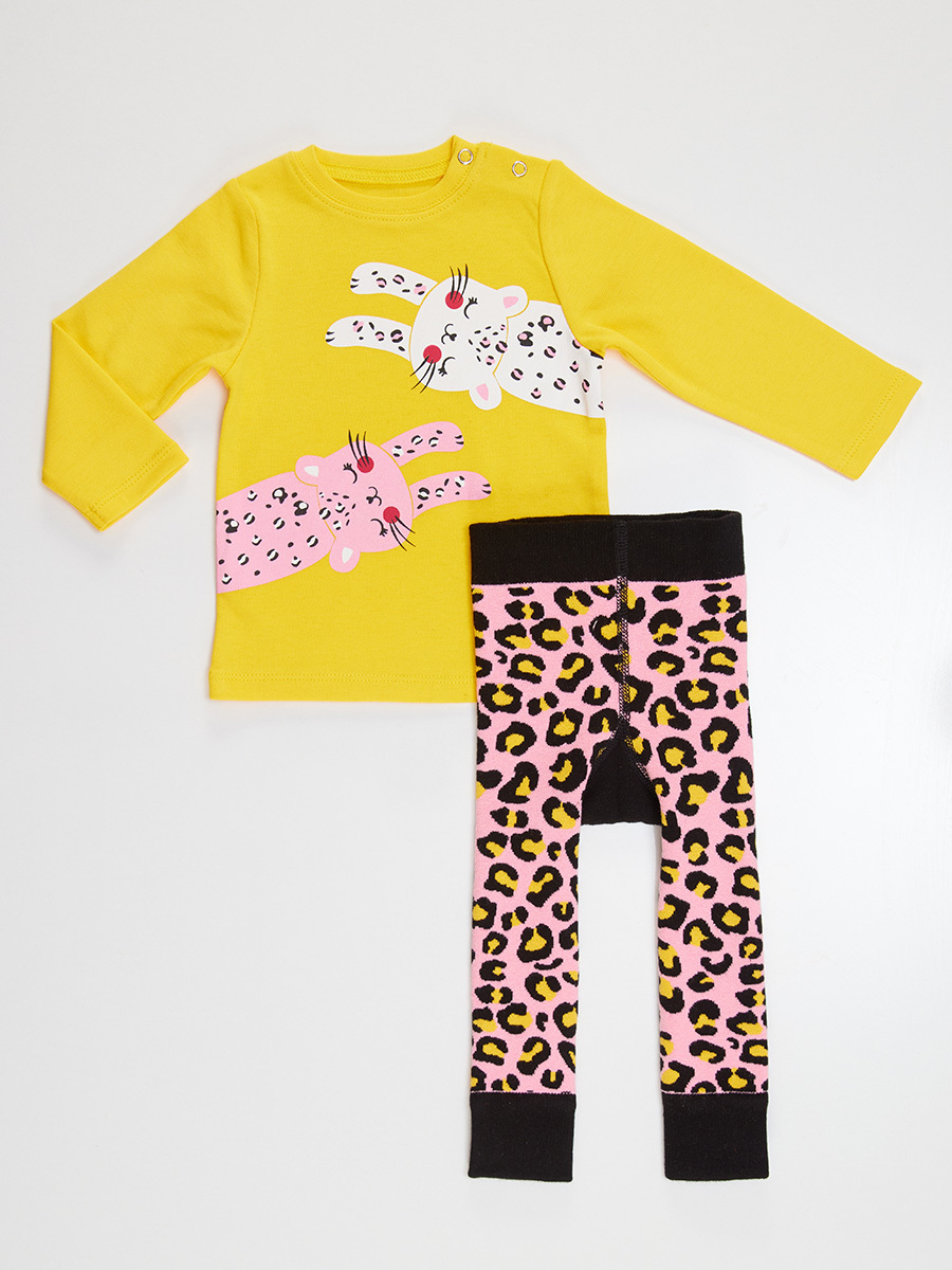 2'li kız bebek takım. %100 pamuklu kumaştan, yakası çıtçıtlı, önü leopar baskılı t-shirt. Ve kalın, pamuklu, havlu tarzı örmeden, tayt pantolon. Bebeklerin rahat hareket etmesi düşünülerek esnek tasarlanmıştır. Poposunda sevimli leopar deseni vardır. Tüm Denokids ürünleri çocuk güvenliği düşünülerek üretilmiştir ve iğne dedektörlerinden geçirilmiştir. %90 Pamuk %9 Poliamid %1 Elastan