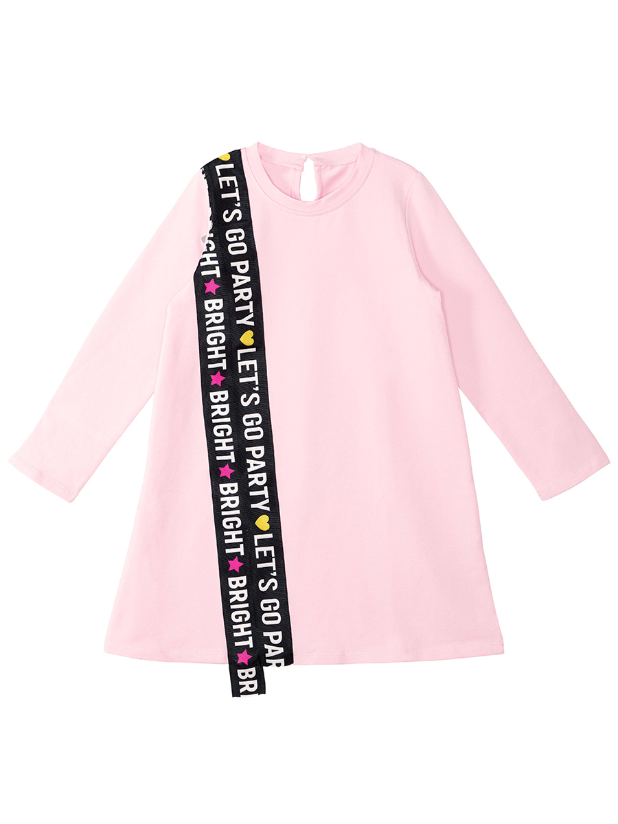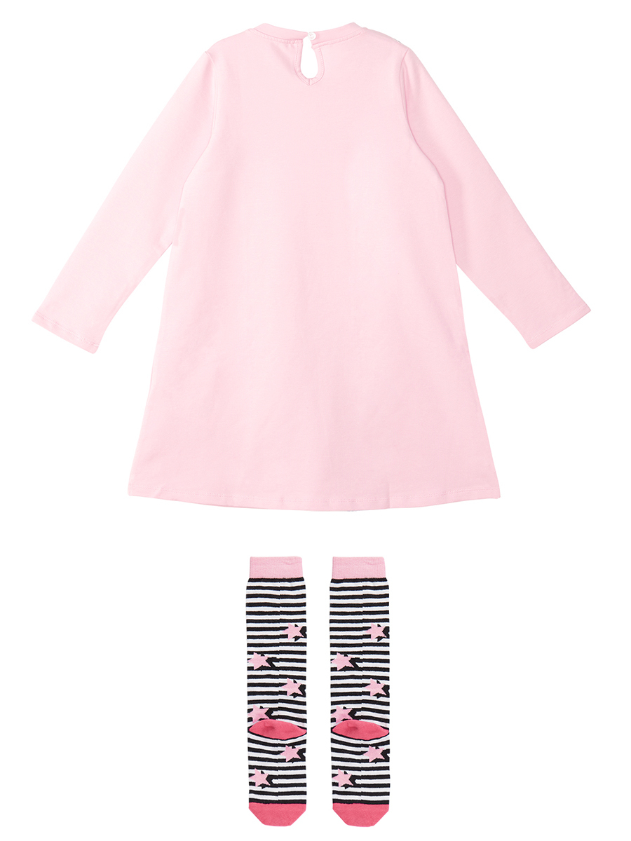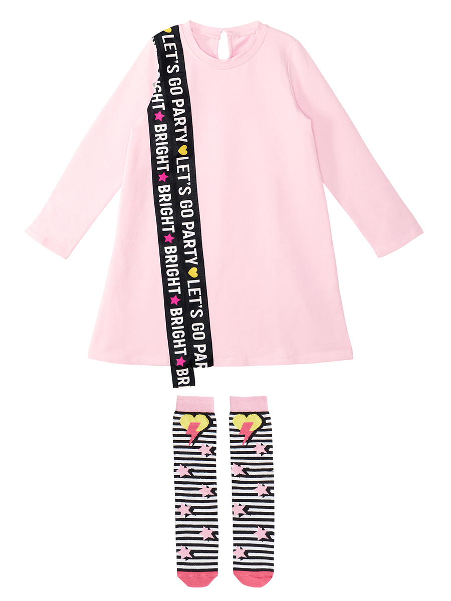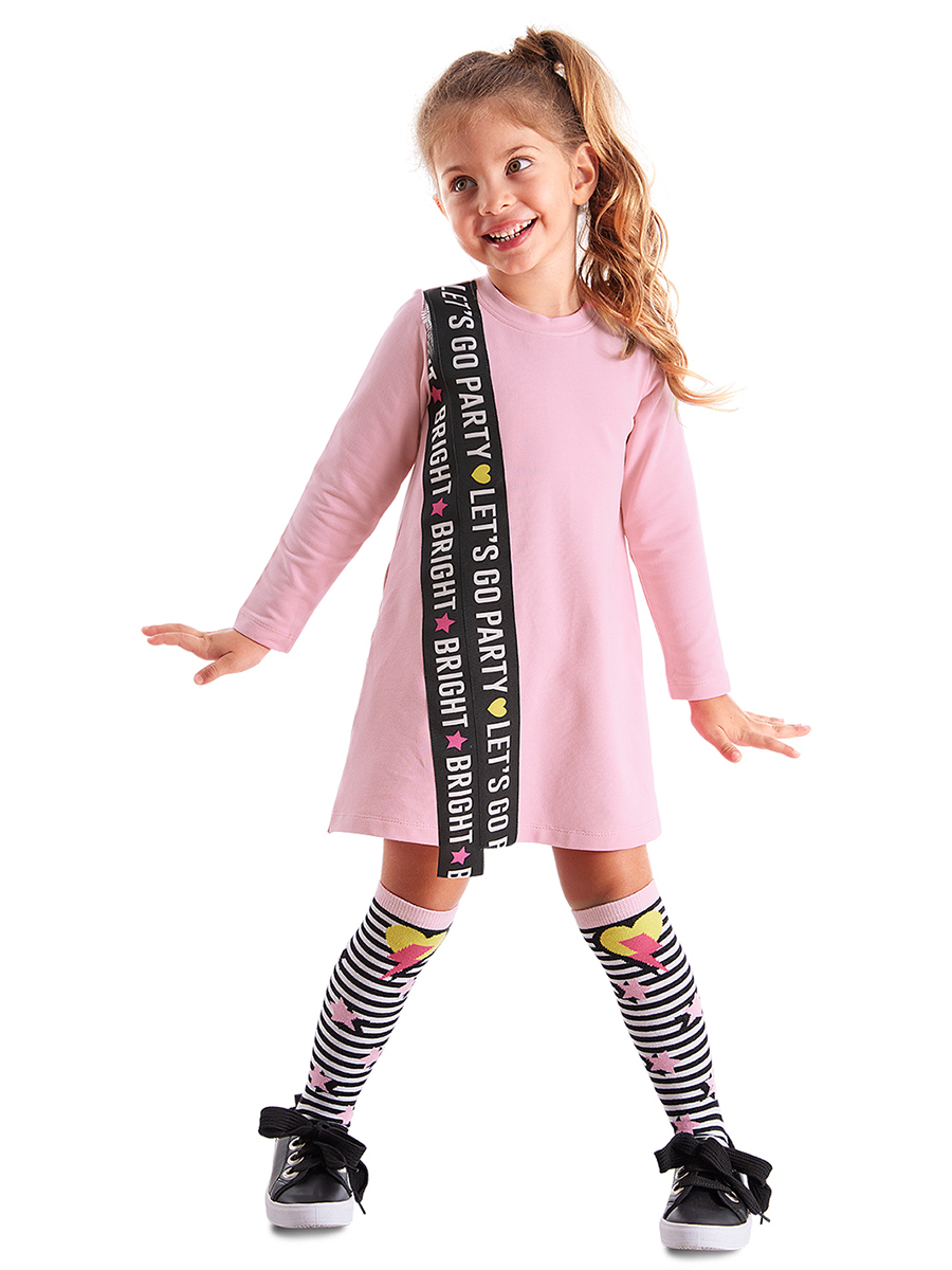 2 parça kız çocuk elbise ve çorap takım. Omuzdan etek ucuna verev bantlar ile tasarlanmış, pembe, pamuklu elbise ve tamamlayıcısı dizaltı çorap. Tarz sahibi kız çocukları için. %100 Pamuk