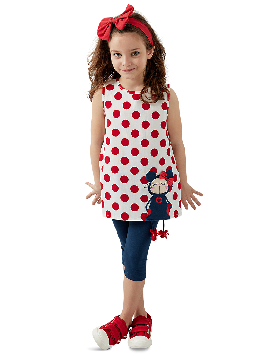 2 piece set. Dotted tunic with a girl aplique on and its matching leggings. The applique on tunic has mobile legs. Top: 100% Cotton - Bottom: 95% Cotton 5% Elastane