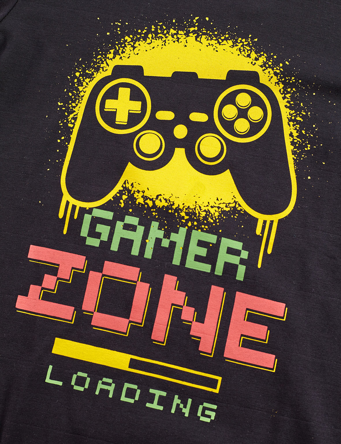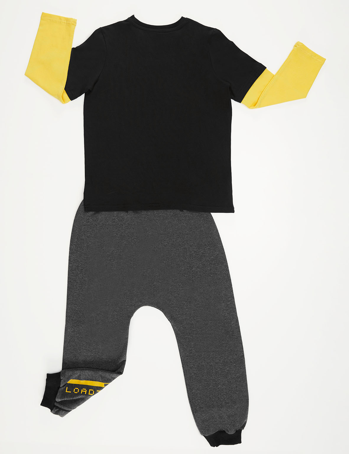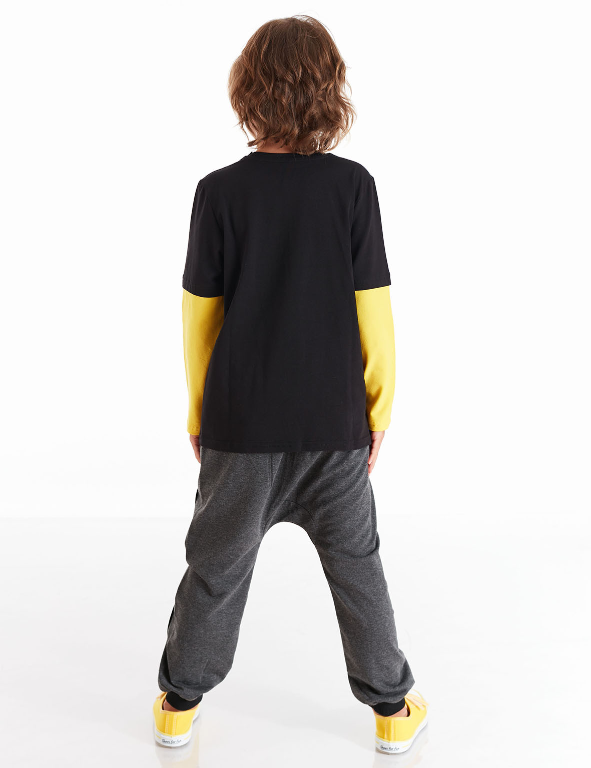 2 piece boy set. Cotton jersey t-shirt designed like it is worn on top of each other. The set is completed with a cotton sweat-pants. There are thin stripes all along both lega and a printon cuff.