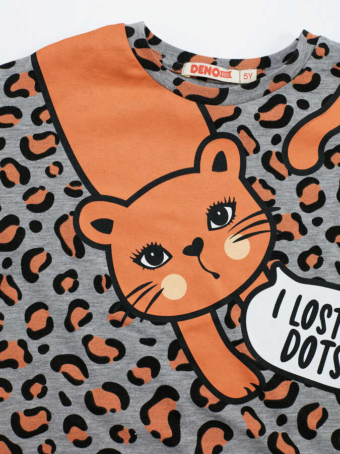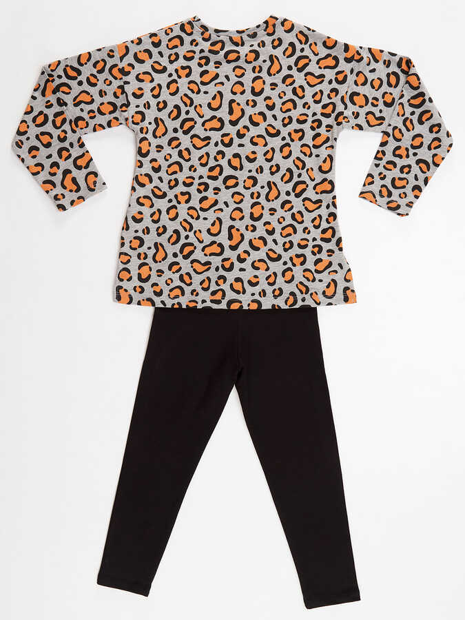 2'li takım. Pamuklu penye kumaştan üzeri leopar baskılı, uzun kollu tunik. Takımın tamamlayıcısı orta kalın pamuklu kumaştan siyah tayt. Üst: %65 pamuk %35 polyester Alt: %92 pamuk %8 elastan