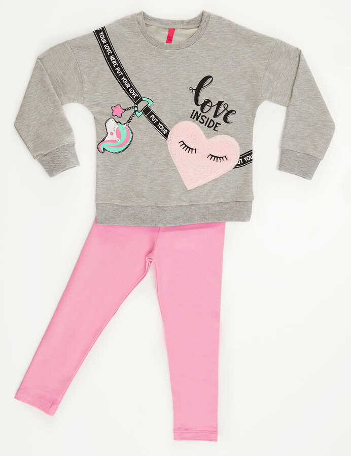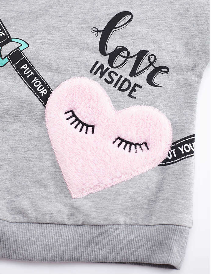 2 parça kız sweatshirt ve tayt takım. Gri melanj, pamuklu swaetshirt. Üzerine çanta takılmış gibi eğlenceli tasarım ve çantadaki kalp peluştan yapılmıştır. Takımın tamamlayıcısı, kalın pamuklu kumaştan, elastik pembe tayt. top %92 pamuk %8 elastan, Alt: %92 pamuk %8 elastan