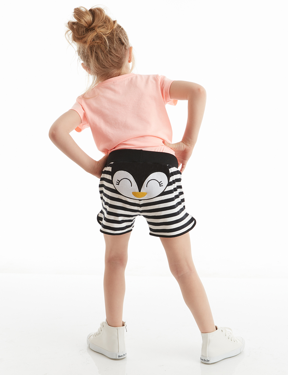 2 piece girl shorts and t-shirt set. T-shirt with a penguin print on. Striped girl shorts with a penguin applique at the back.
