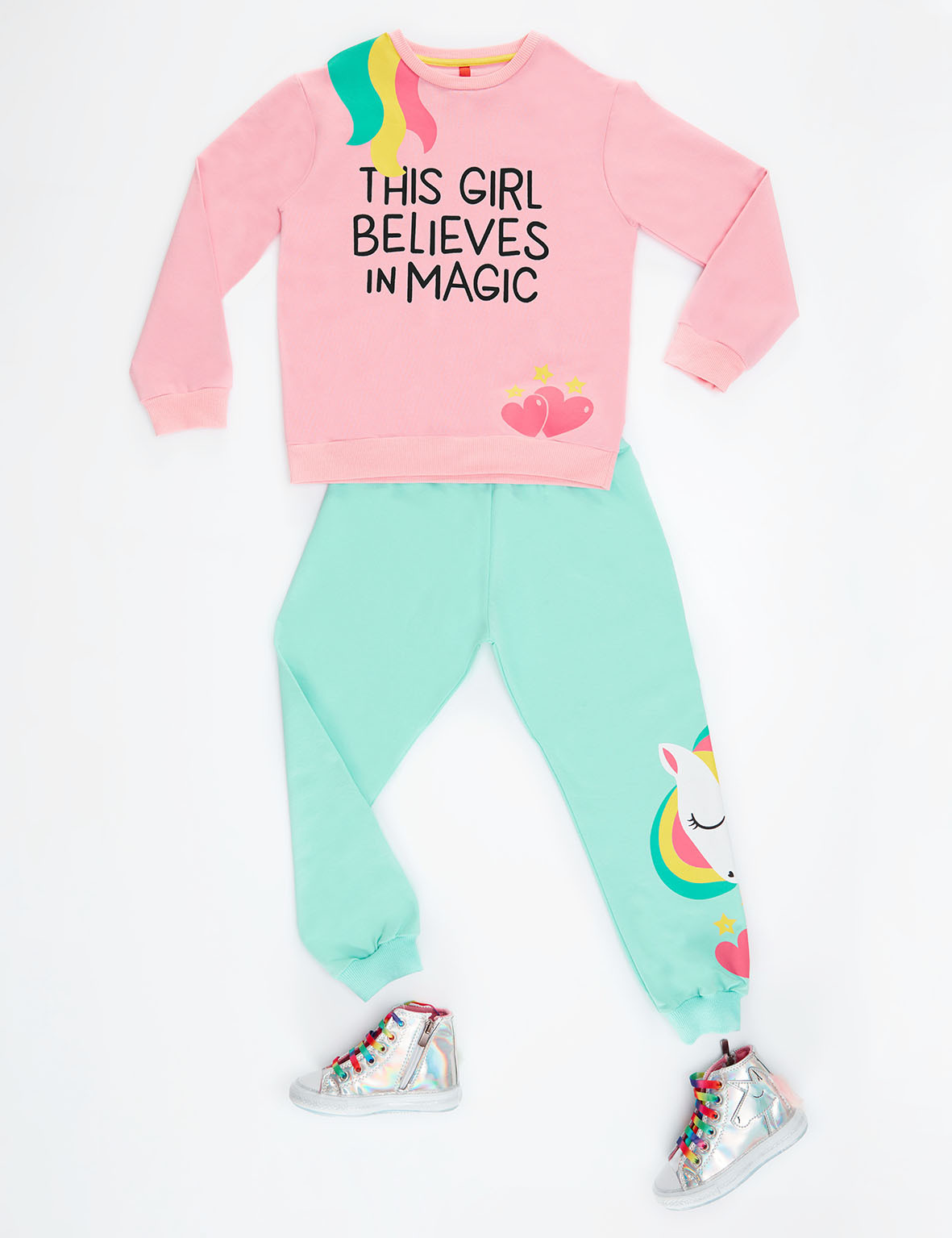 2 piece tracksuit. Cotton, pink sweat-shirt with a print on. And its matching cotton sweat-pants with unicorn print on single leg. top %92 cotton %8 elastane bottom;%92 cotton %8 elastane