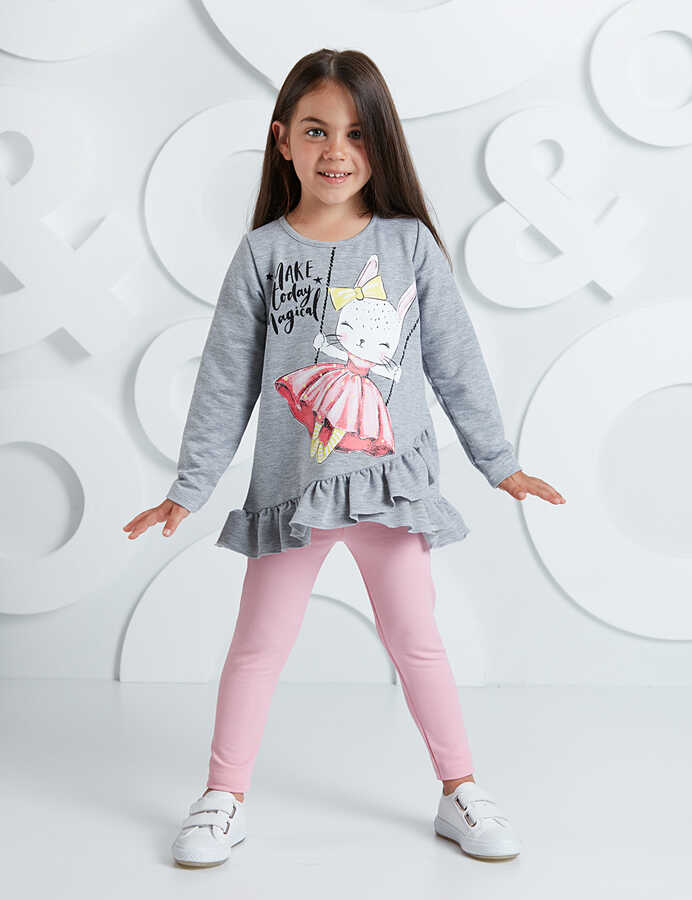 2 parça takım. Etek uçları çapraz kesimli, fırfırlı, baskılı tunik ve uyumlu pembe tayt. Üst: %50 Pamuk %45 Polyester %5 Elastan Alt: %92 Pamuk %8 Elastan