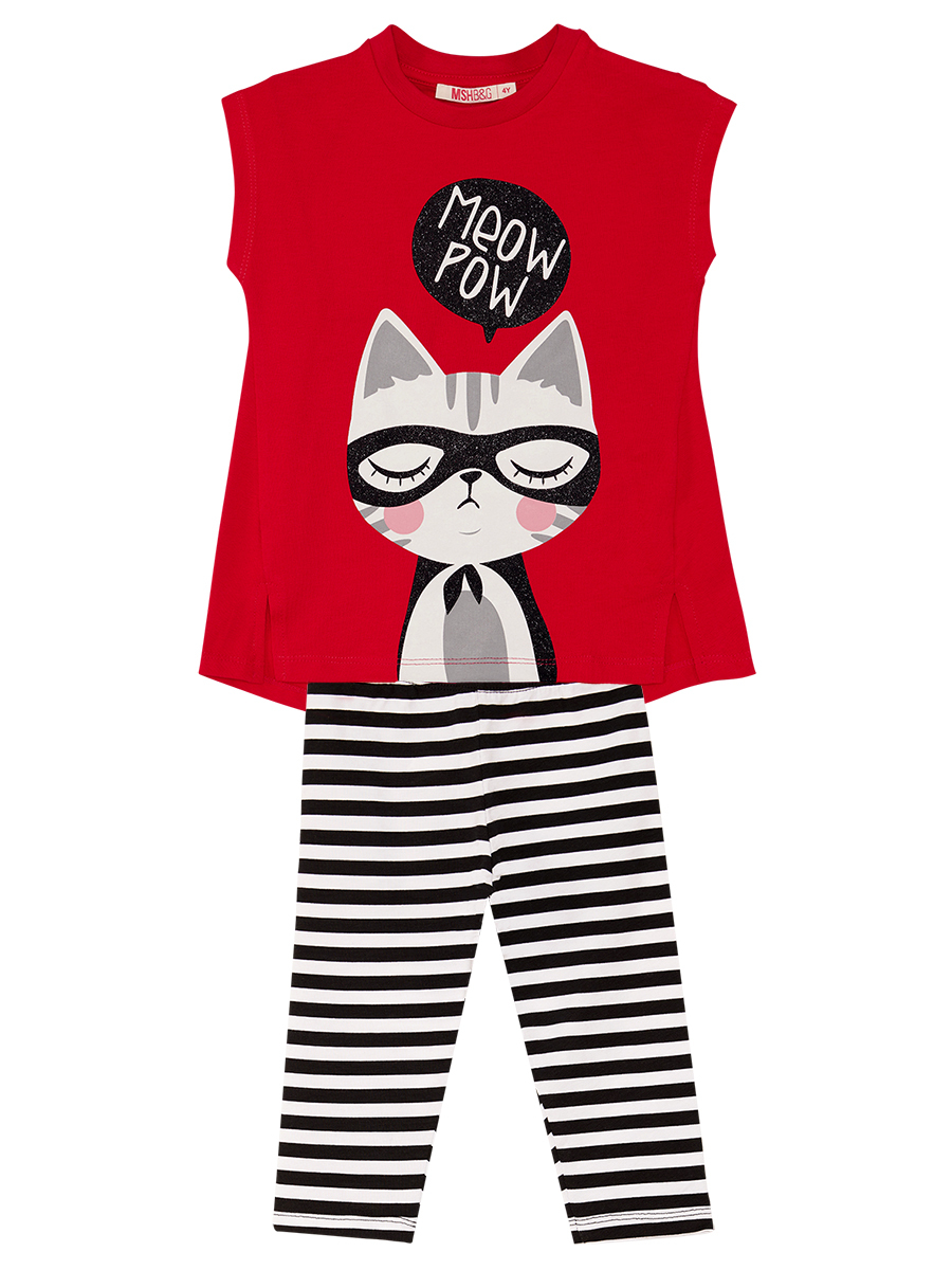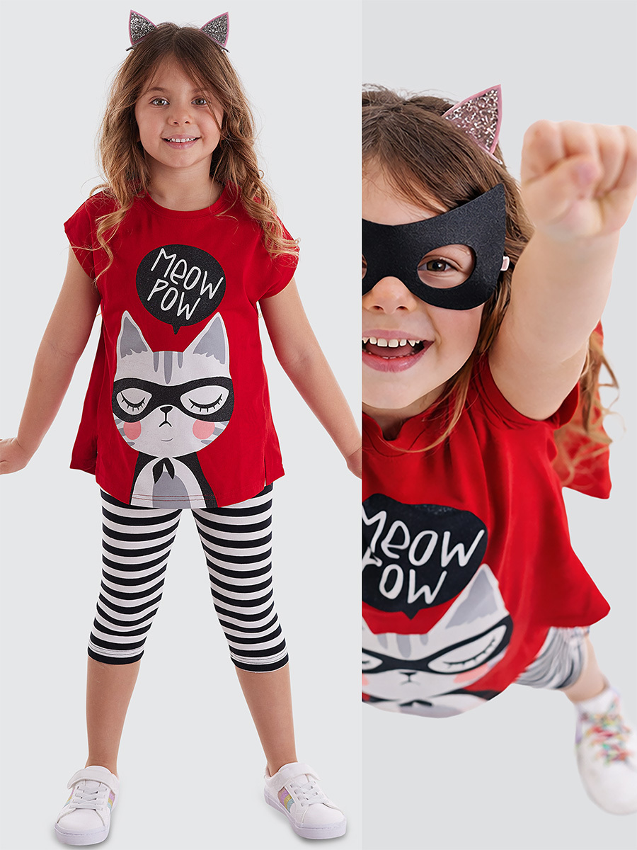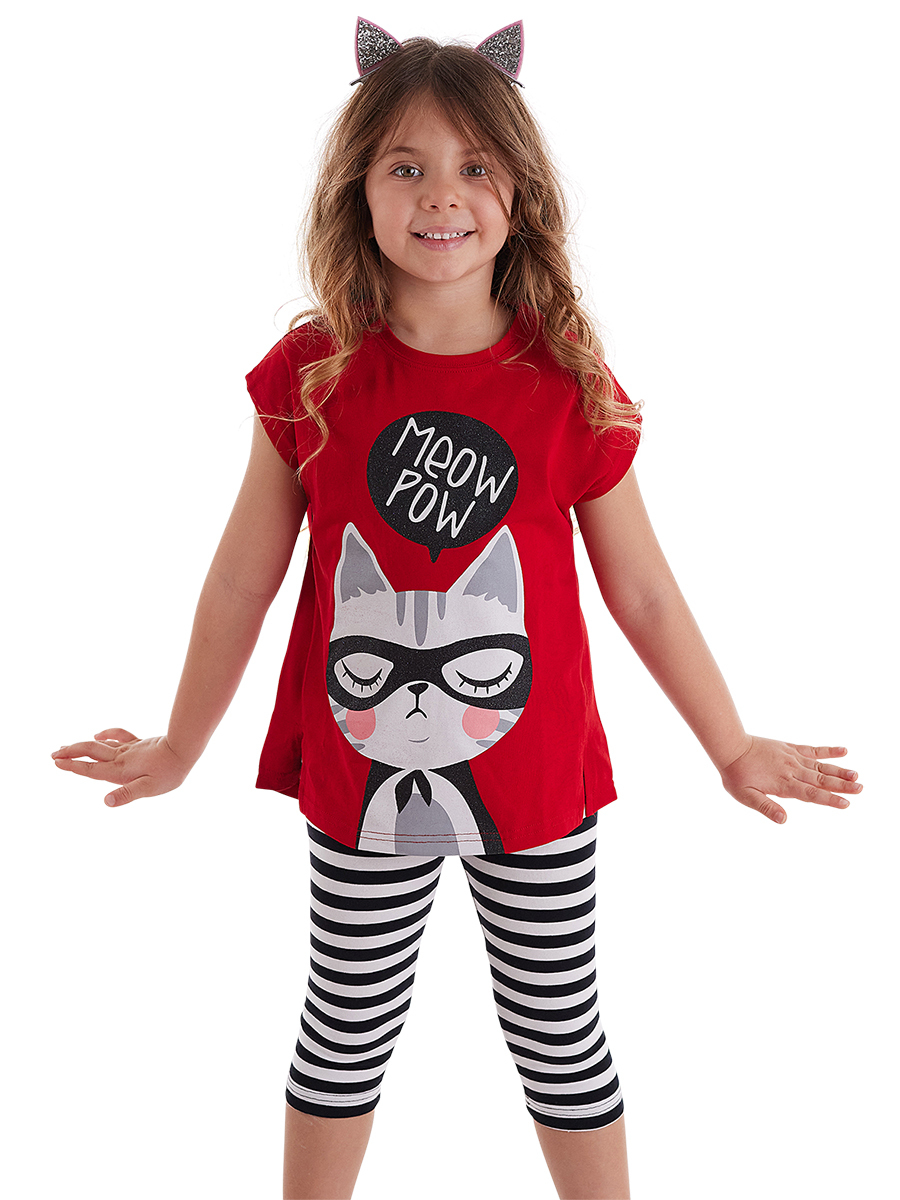 Kırmızı Meow Pow Çizgili Kız Çocuk Yazlık T-shirt Tayt Takım