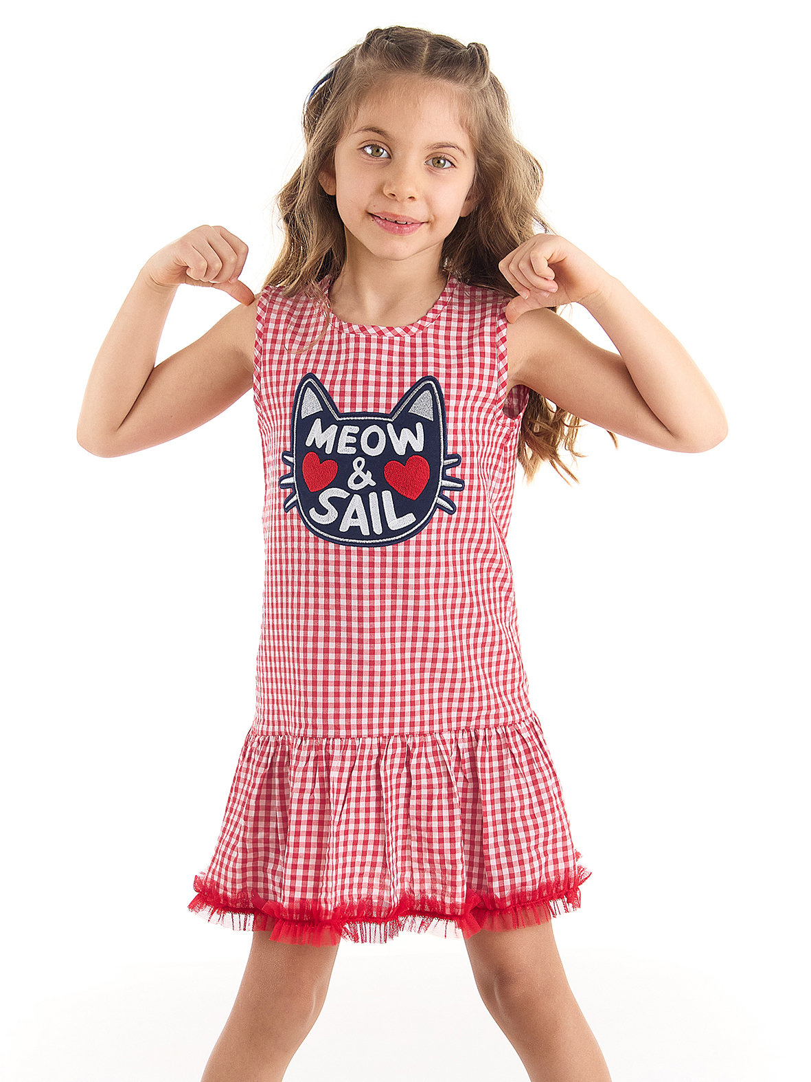 Plaid dress made of woven fabric. There is a cat applique on the chest and tulle ruffles at skirt. %50 cotton %50 polyester
