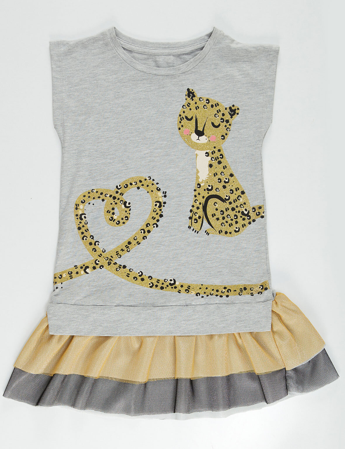 Grey girl dress with shiny leopard print on and 2 layered tulle ruffles on skirt. 65% Cotton 30% Polyester 5% Elastane