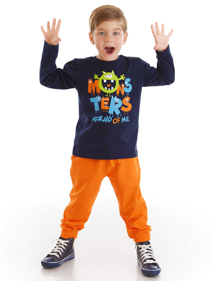 2 piece set. Tee made of cotton jersey. Has a funny monster print on. The set is completed with mid-thick cotton pants. Has side pockets. Elastic bant and strings on waist. Top: 92% cotton, 8% elastane. Bottom: 92% cotton, 8% elastane.