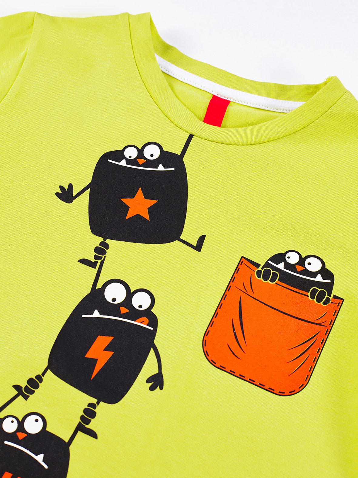 2 piece boy shorts and t-shirt set. Cotton jersey, t-shirt with little monsters print on. Cotton jersey boy shorts with a funny face on single leg.
