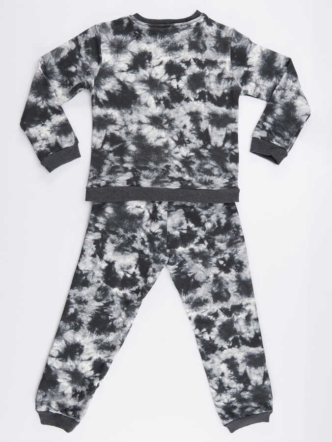 2 parça erkek çocuk eşofman takım. Pamuklu orta kalın, batik desenli kumaştan, üzeri baskılı sweatshirt ve orta kalın, pamuklu kumaştan, yanları şerit detaylı ve cepli eşofman altı. Üst, Alt: %100 pamuk