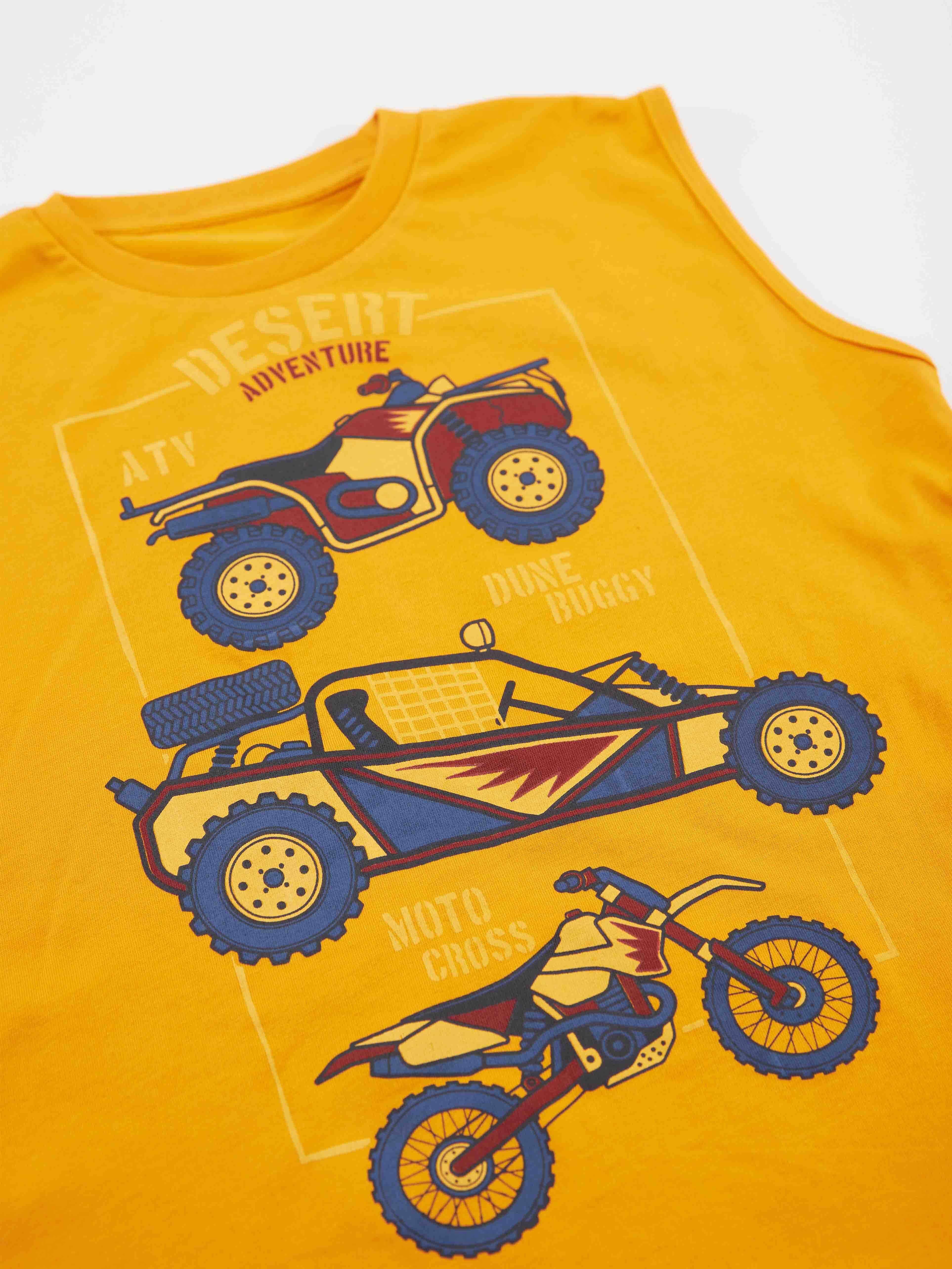 2 parça erkek çocuk t-shirt ve kapri pantolon takım. Pamuklu penye kumaştan üzeri mptprsiklet baskılı, kolsuz t-shirt. Ve takımın tamamlayıcısı pamuklu penye kumaştan, düşük ağ kesimli kapri boy pantolon. Pantolon 2 ceplidir. Beli lastik ve kordonludur. Tüm Denokids ürünleri çocuk güvenlik kurallarına uygun üretilmekte ve tek tek iğne dedektörlerinden geçmektedir.
