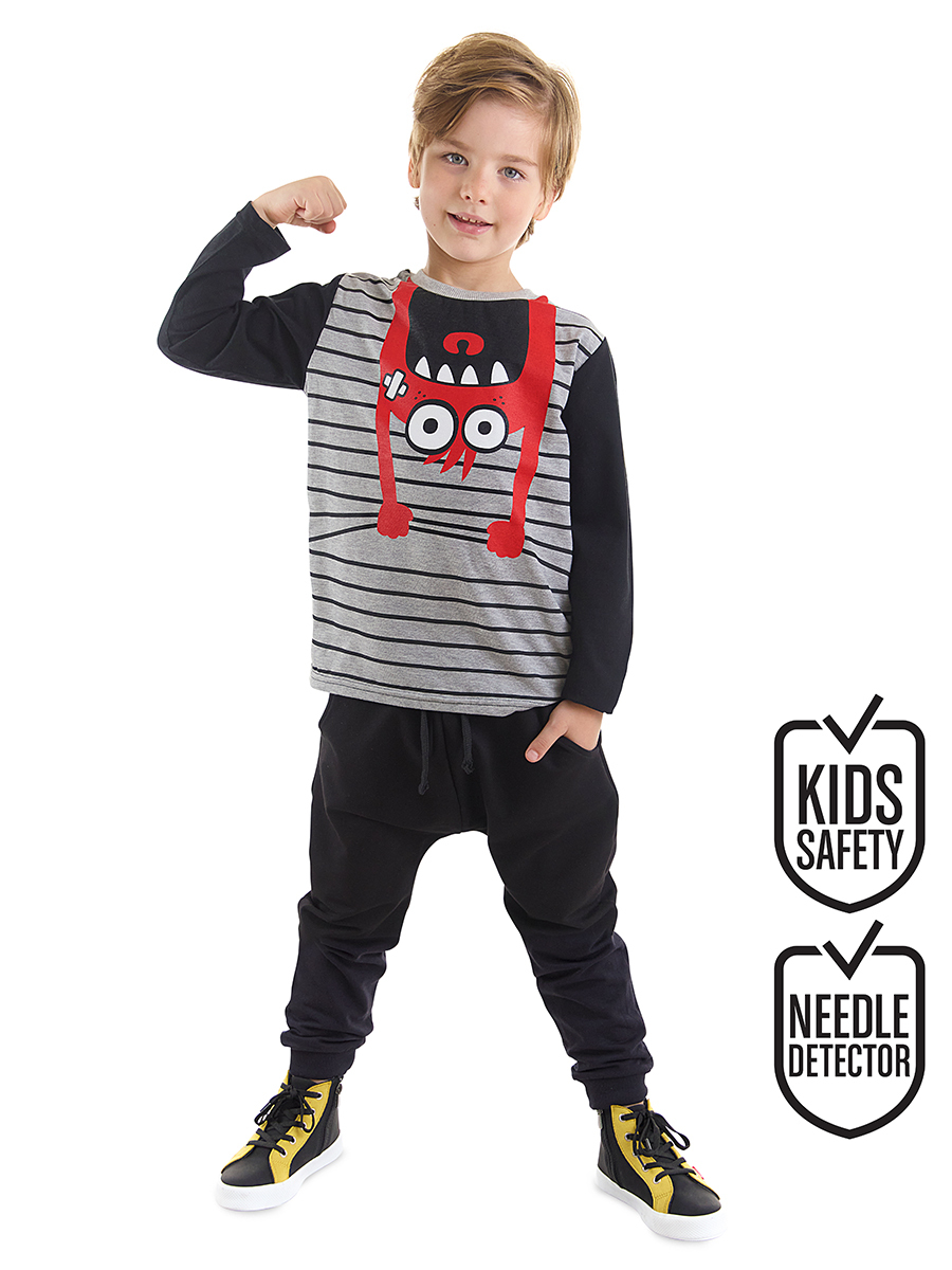 2 piece set. Monster printed, long sleeve, cotton jersey t-shirt. The set is completed with mid-thick cotton pants with 2 side pockets. Elastic waist and strings. All Denokids products are produced with kids safety guidelines.