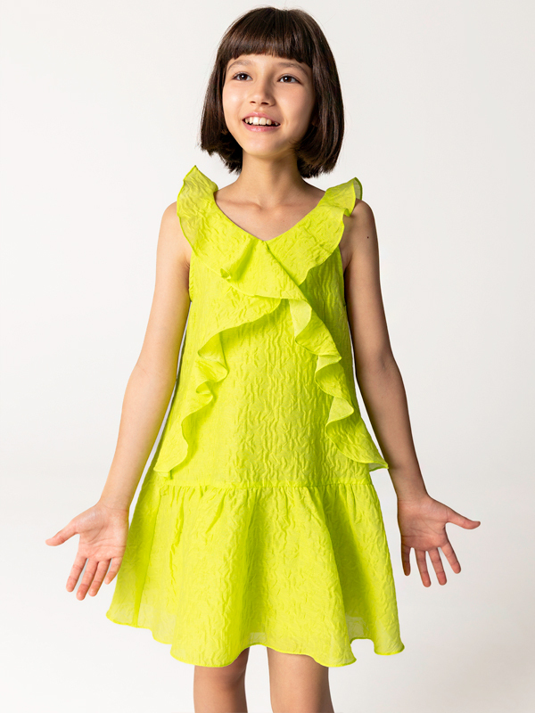 Neon Yeşil Kolsuz Fırfırlı Kız Çocuk Elbise