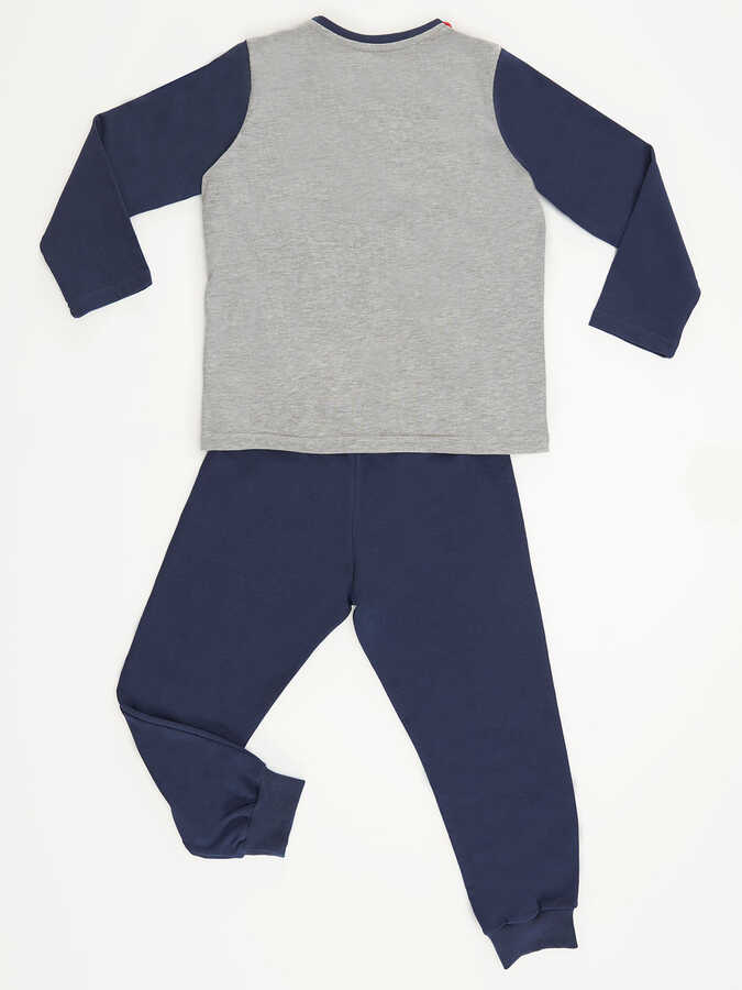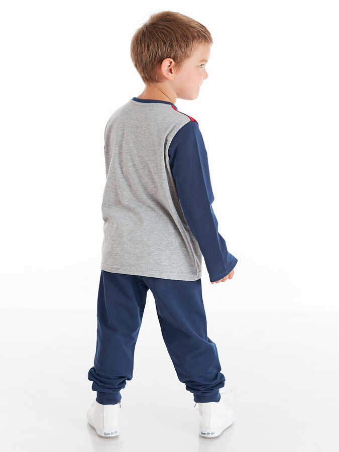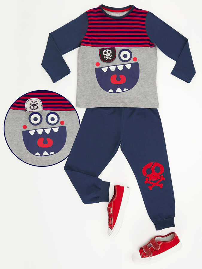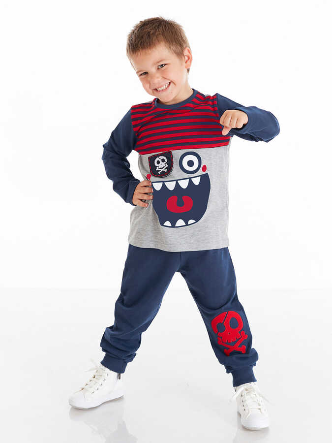 2 parça erkek çocuk takım. 3 renk kumaş ile tasarlanmış, korsan baskılı t-shirt. T-shirt'teki korsanın göz bandı 3 boyutludur. Takımın tamamlayıcısı, lacivert eşofman altının bir dizinde kurukafa baskısı vardır. Alt: %92 pamuk %8 elastan, Üst: %92 pamuk %8 elastan