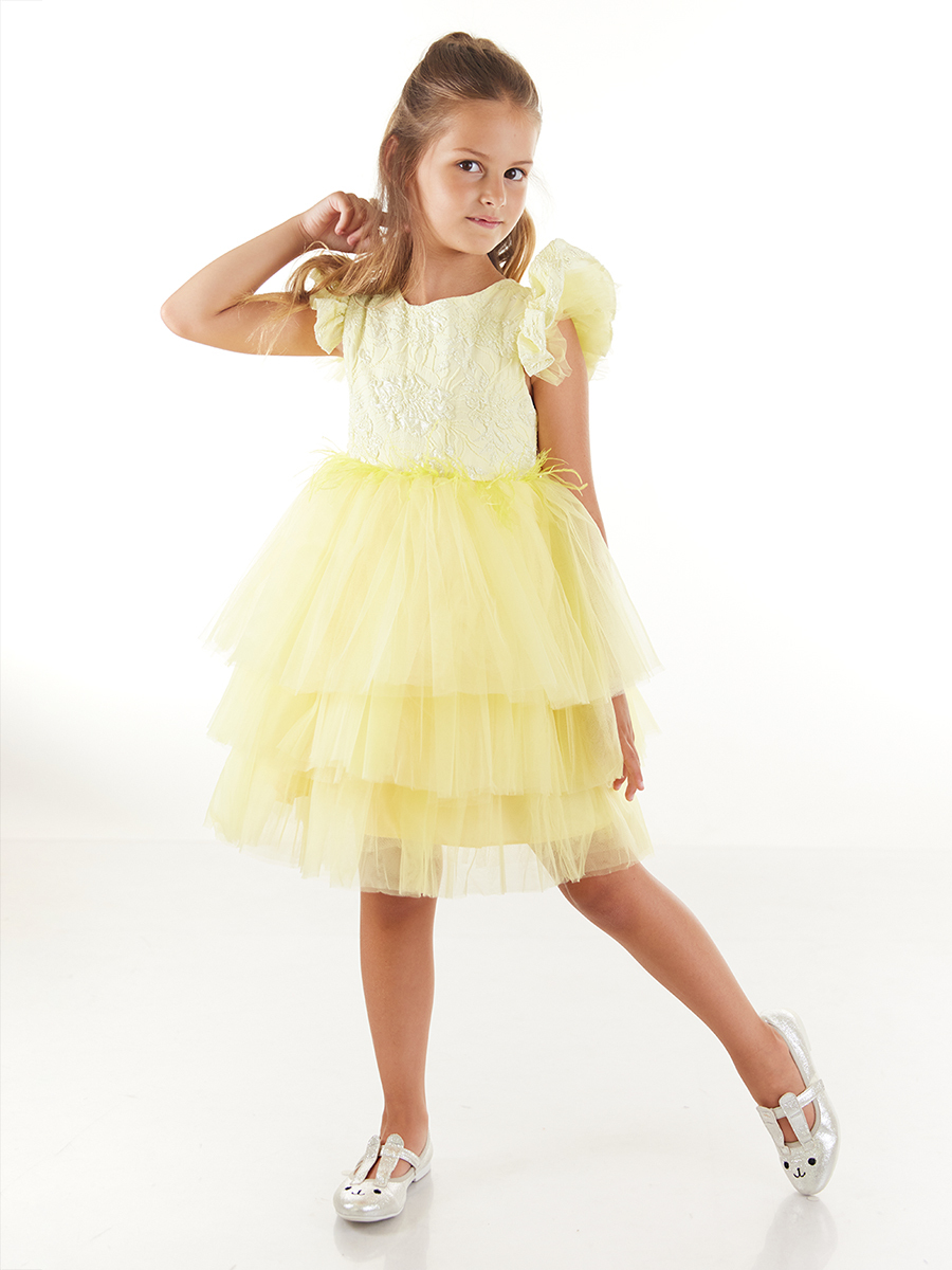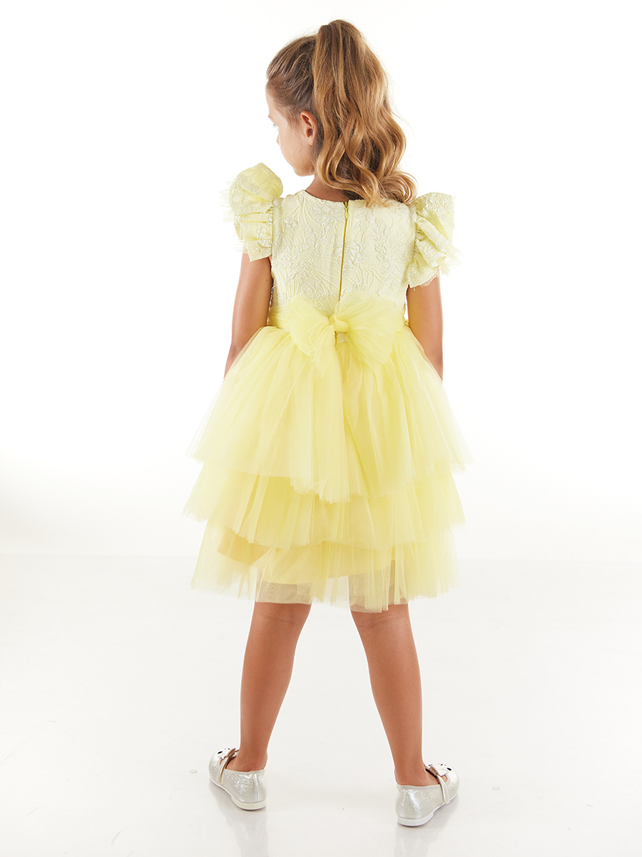 Bisiklet yakalı. Kısa kollu. Kolları tüllü ve belinde otriş detayları vardır. Üst gövdesi kabartmalı simli kumaştan yapılmıştır. Kabarık, 3 katlı tül eteği bulunmaktadır. Arkasındaki gizli fermuar sayesinde kolayca giyilip çıkarılabilir. Astarlıdır. Arka belinde tülden bağlanabilen bir fiyonk detayı yer alır. Bu elbise, kızınızın düğün, nişan ve özel günlerde vazgeçilmezi olacak.