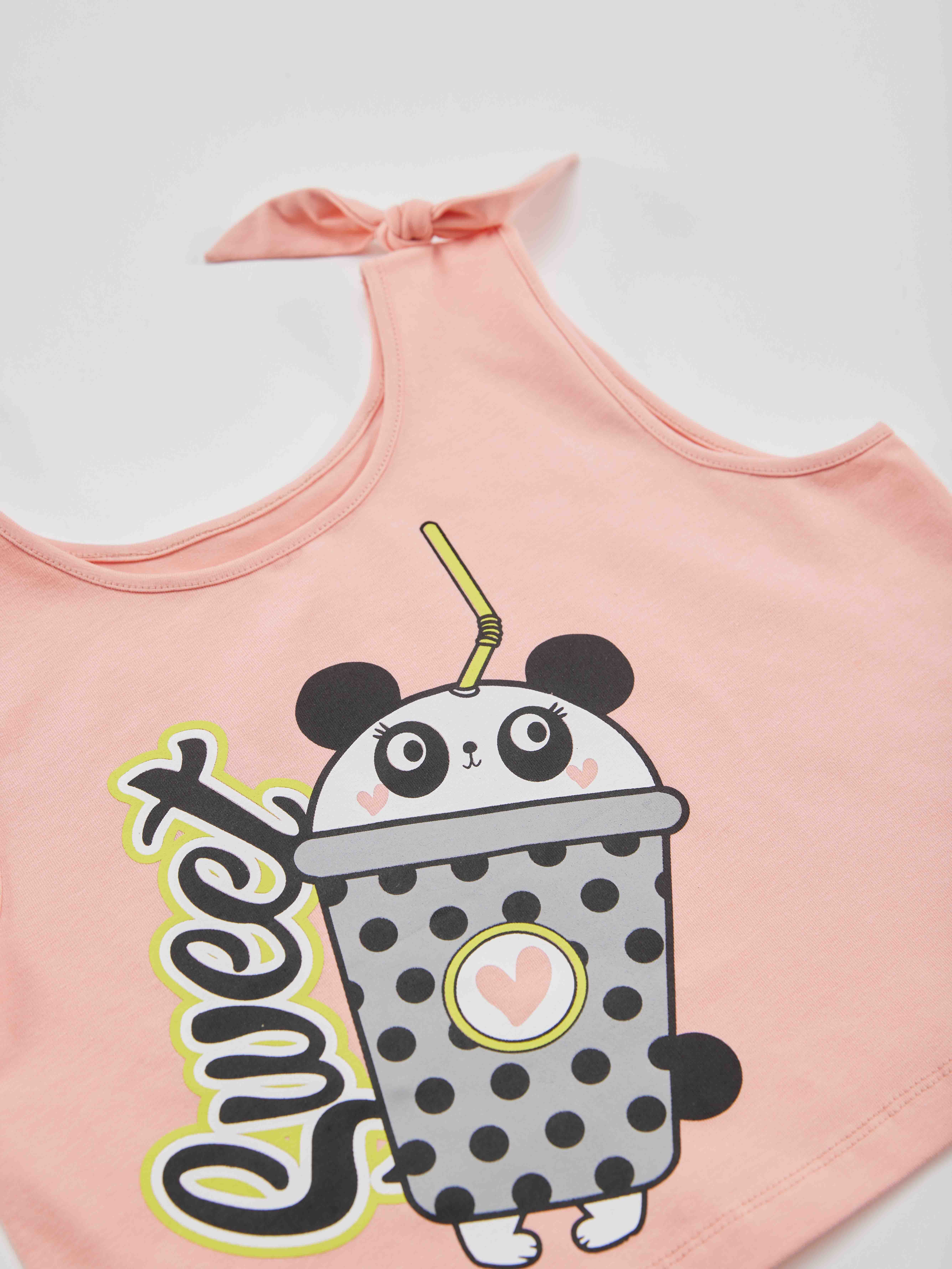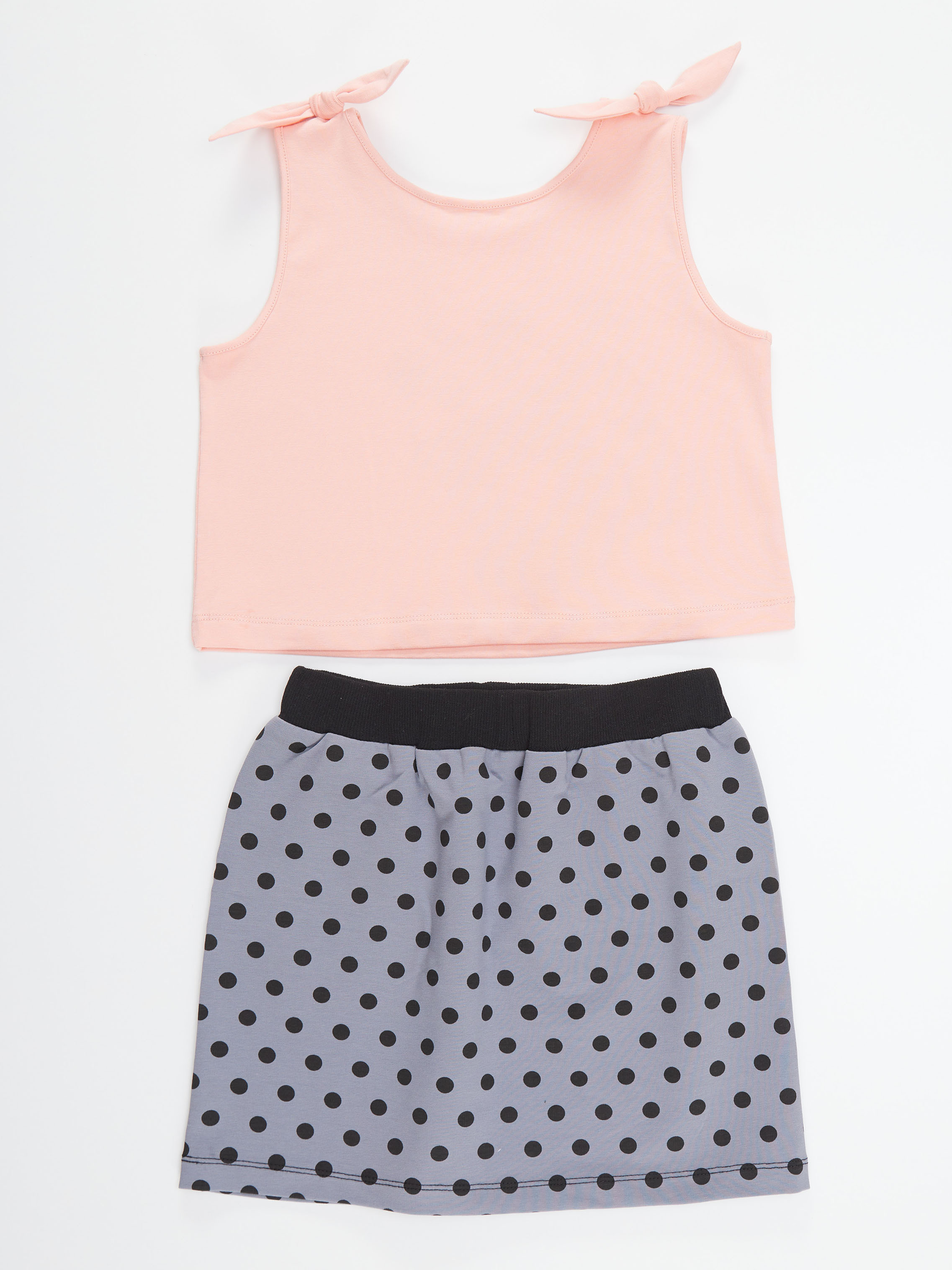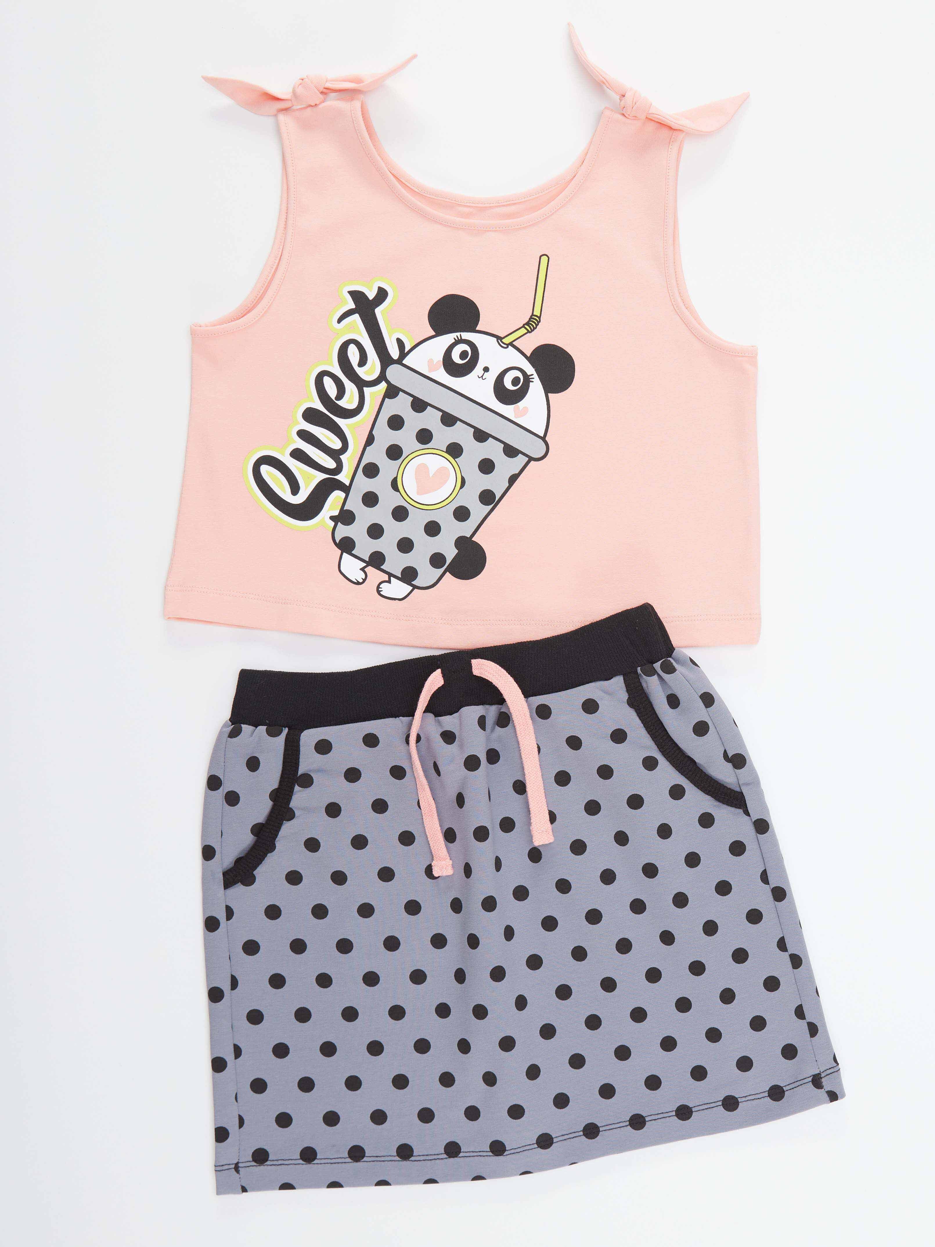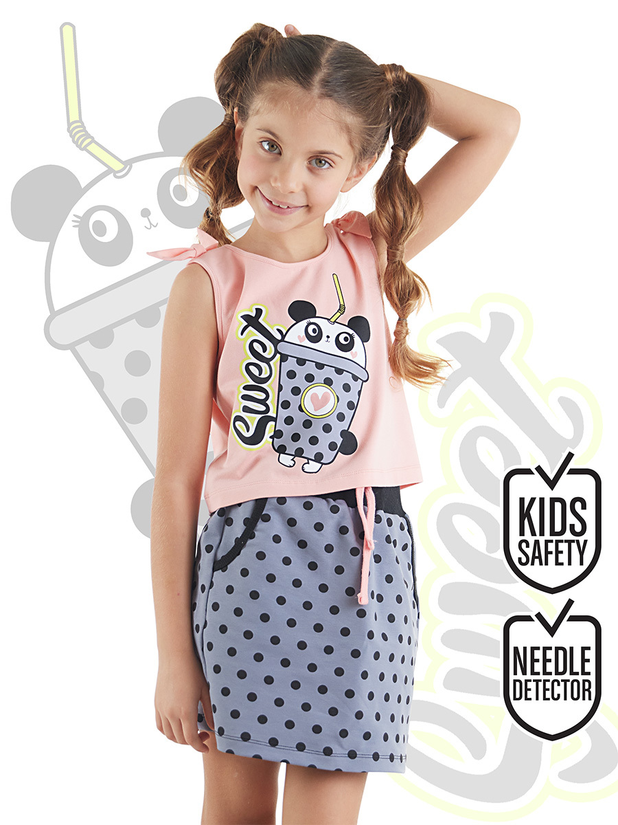 2 parça kız çocuk etek ve crop-top t-shirt takım. Pamuklu penye kumaştan, mini etek. Eteğin beli lastikli ve önünde 2 cebi vardır. Pamuklu penye kumaştan kısa kesim t-shirt. T-shirt'ün üzerinde panda baskısı vardır ve omuzlarında bağlanabilir fiyonk vardır. Tüm Denokids ürünleri çocuk güvenlik kurallarına uygun üretilmekte ve tek tek iğne dedektörlerinden geçmektedir. Üst: %95 Pamuk %5 Elastan - Alt: %70 Pamuk %25 Polyester %5 Elastan