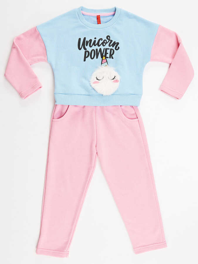 2 parça kız çocuk eşofman takım. Takımın üstünde iki farkı renk kumaş kullanılmıştır ve crop-top olarak tasarlanmıştır. Eşofman üstü baskılıdır ve üzerinde tüylü peluş kumaştan 3 boyutlu şirin bir unicorn vardır. Peluş zemine cırt cırt ile tutturulmuştur, yıkama öncesi çıkarılabilir. Eşofman altının beli ve paçaları lastiklidir. 2 tane yan cebi vardır. Üst, Alt: %65 pamuk %35 polyester