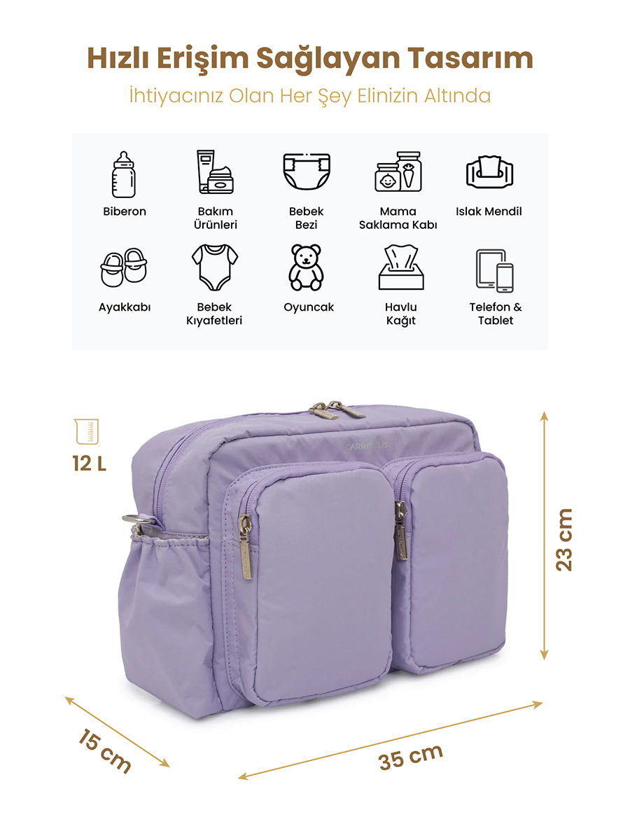 Detaylar Boyutlar – 35 cm G × 23 cm Y × 15 cm D Kapama – Fermuarlı ana bölme, eşyaları güvenli ve düzenli şekilde saklar Ek Cepler – 2 adet fermuarlı ön cep, hızlı erişilmesi gereken ürünler için idealdir Askılar – Ayarlanabilir ve çıkarılabilir omuz askısı, kişiye göre konforlu taşıma sunar Bebek Arabası Askısı – Bebek arabasına kolay takılan askı, hareket hâlindeyken maksimum pratiklik sağlar Kumaş – Antibakteriyel astar, hijyen seviyesini artırır Ekstralar – Hafif tasarımı sayesinde günlük kullanım ve seyahat için uygundur Test – Uluslararası ASTM antibakteriyel testi onaylıdır; 24 saatte %99 bakteri azalımı sağlar Özellikler • Antibakteriyel astar, bebek bakım ürünleri için hijyenik saklama ortamı sunar • 2 fermuarlı ön cep ve geniş ana bölme sayesinde eşyalar kolayca düzenlenir • Ayarlanabilir ve çıkarılabilir askı ile omuzda veya çapraz olarak taşınabilir • Bebek arabası askıları hızlı kullanım ve ekstra rahatlık sağlar • Hafif yapısı uzun süreli taşımalarda konfor sunar • Günlük kullanım, park gezileri, seyahatler ve alışveriş için ideal tasarım Ürün Hikayesi DuoPack, modern ebeveynlerin günlük hayatında ihtiyaç duyduğu düzeni, konforu ve şıklığı bir arada sunmak amacıyla tasarlandı. İsmini çift yönlü kullanım kolaylığından alan bu model, hem geniş iç hacmi hem de çoklu göz yapısıyla bebek bakım ürünlerinin her zaman el altında olmasını sağlar. DuoPack’in antibakteriyel astarlı iç yüzeyi, bebek ürünleri için güvenli ve hijyenik bir alan oluşturur. Fermuarlı ana bölmesi ve iki adet ön cebi, bezlerden yedek kıyafetlere, atıştırmalıklardan küçük aksesuarlara kadar her eşyanın düzenli bir şekilde taşınmasına yardımcı olur. Ayarlanabilir ve çıkarılabilir askısı, ebeveynlere kişisel konfor sunarken, bebek arabası askıları hareket hâlindeyken ekstra pratiklik sağlar. Günlük yürüyüşlerde, kısa seyahatlerde veya şehir içi işlerde ebeveynlerin yükünü hafifletmek için tasarlanan DuoPack, işlevselliği modern bir tasarımla buluşturarak her anı daha kolay, düzenli ve keyifli hâle getirir. %100 polyester
