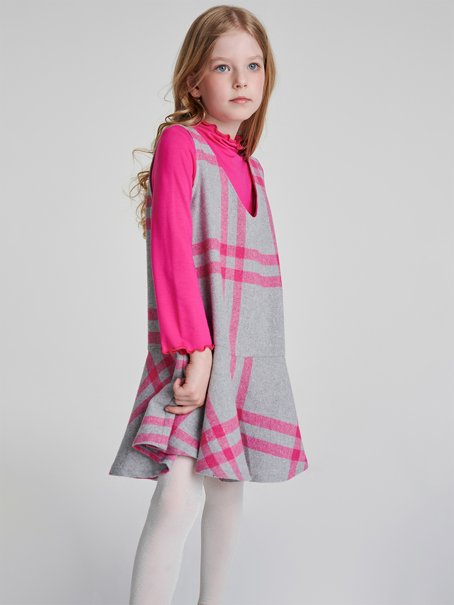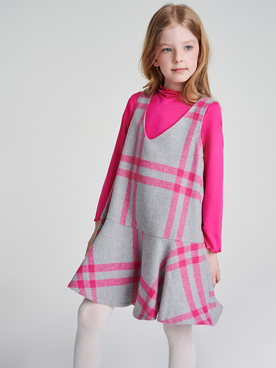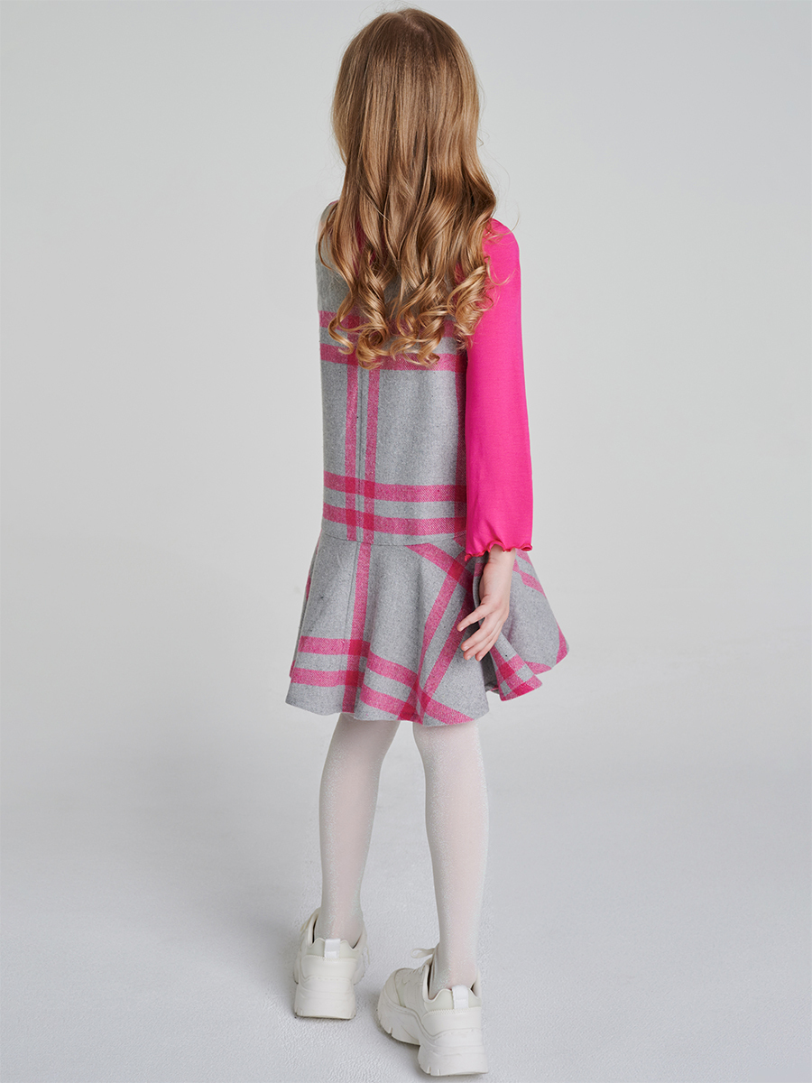 Pembe Ve Gri Kareli Kaşe Kumaştan Tasarlanmış Jile Elbisenin Etekleri Fırfır Detaylıdır. İçinde Örme Yumuşak Blüzü İle Takımdır. %100Pamuk Astar %100 Pamuk