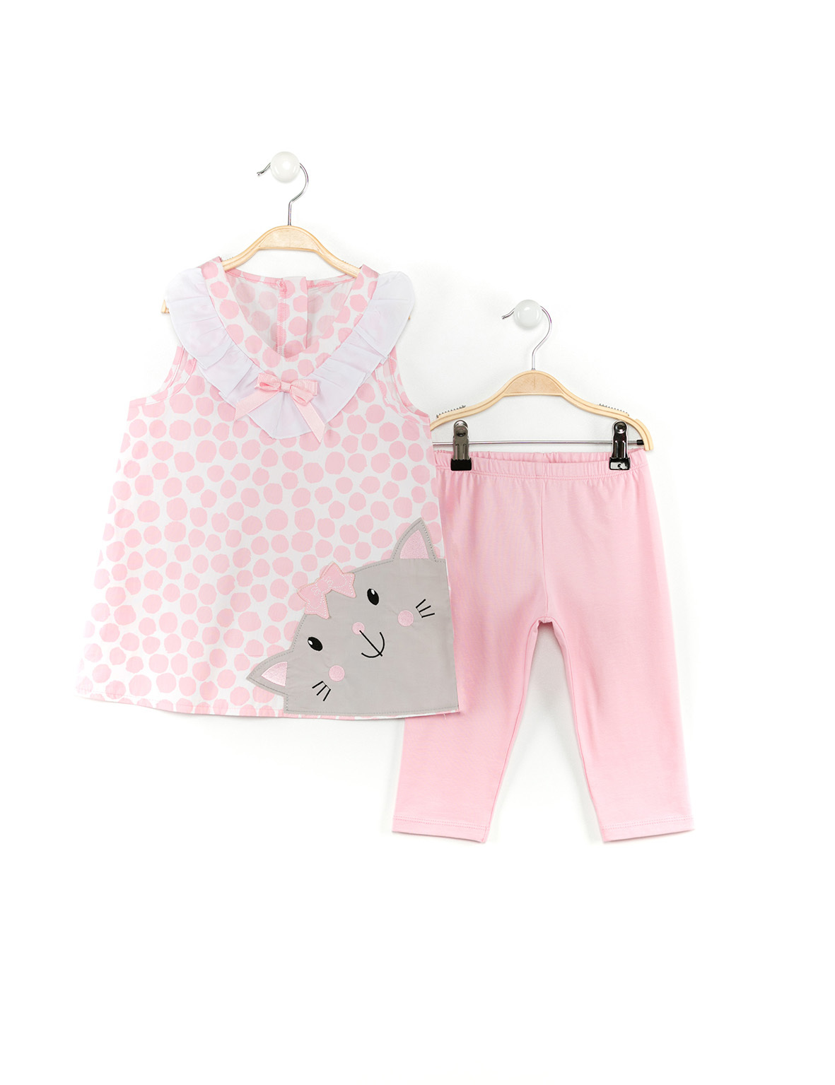 Pembe Puanlı Kedi Kız Çocuk Tunik Tayt Takım