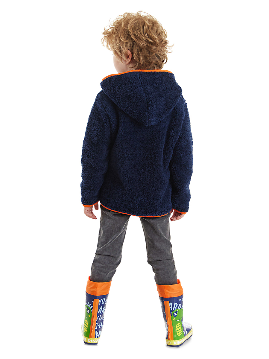 Navy blue plush sweatshirt. Zip-up model. Dino printed pocket on. All Denokids products are produced within kids safety guidelines and dedected by needle dedectors.