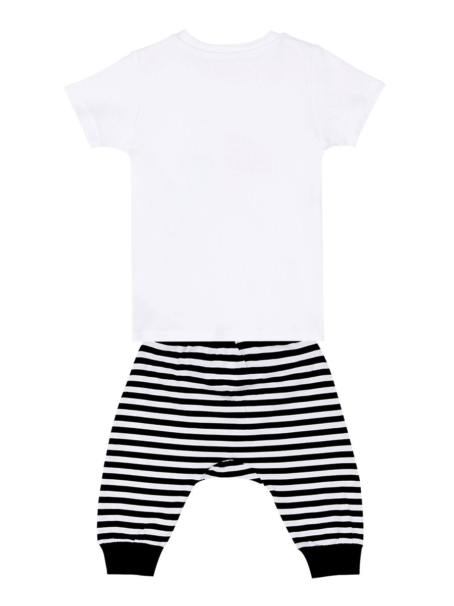 2 piece set. Printed tee and harem style, striped capri pants with croc tail applique on. Top: 100% Cotton - Bottom: 95% Cotton 5% Elastane