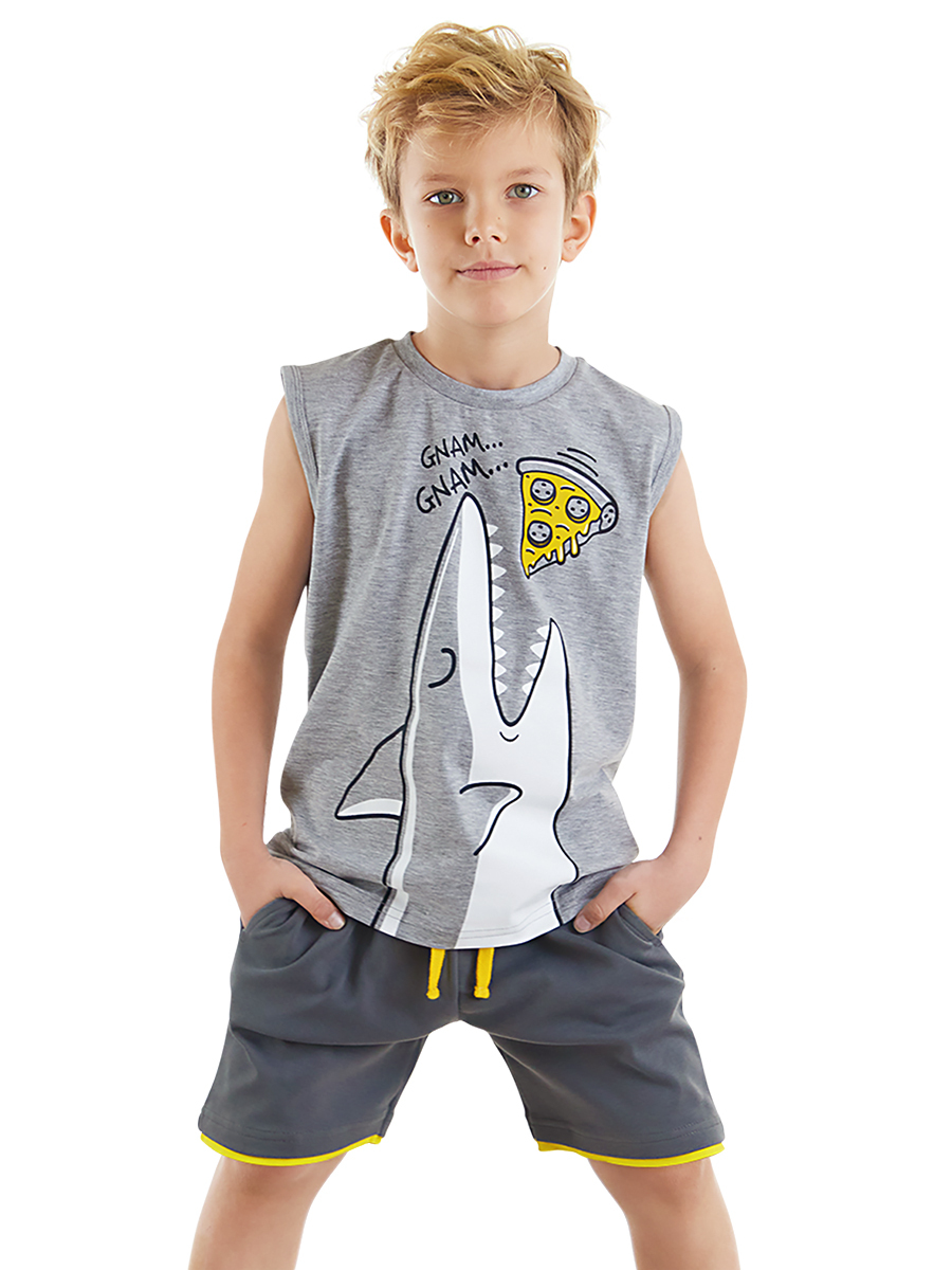 2 parça erkek çocuk t-shirt ve şort takım. Pamuklu penye kumaştan üzeri köpekbalığı baskılı t-shirt. Ve takımın tamamlayıcısı pamuklu kumaştan 2 cepli şort. Şortun beli lastik ve kordonludur. Tüm Denokids ürünleri çocuk güvenlik kurallarına uygun üretilmekte ve tek tek iğne dedektörlerinden geçmektedir. Üst: %65 Pamuk %30 Polyester %5 Elastan - Alt: %95 Pamuk %5 Elastan