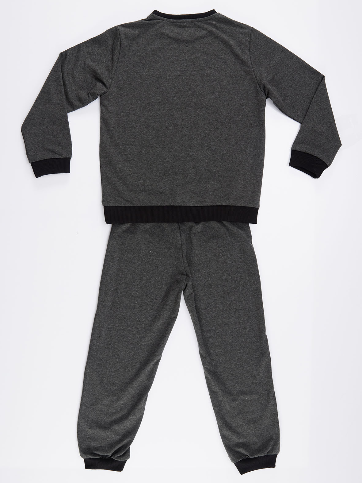 2 parça erkek çocuk eşofman takım. Pamuklu orta kalın kumaştan, üzeri baskılı sweatshirt ve orta kalın, pamuklu eşofman altı.