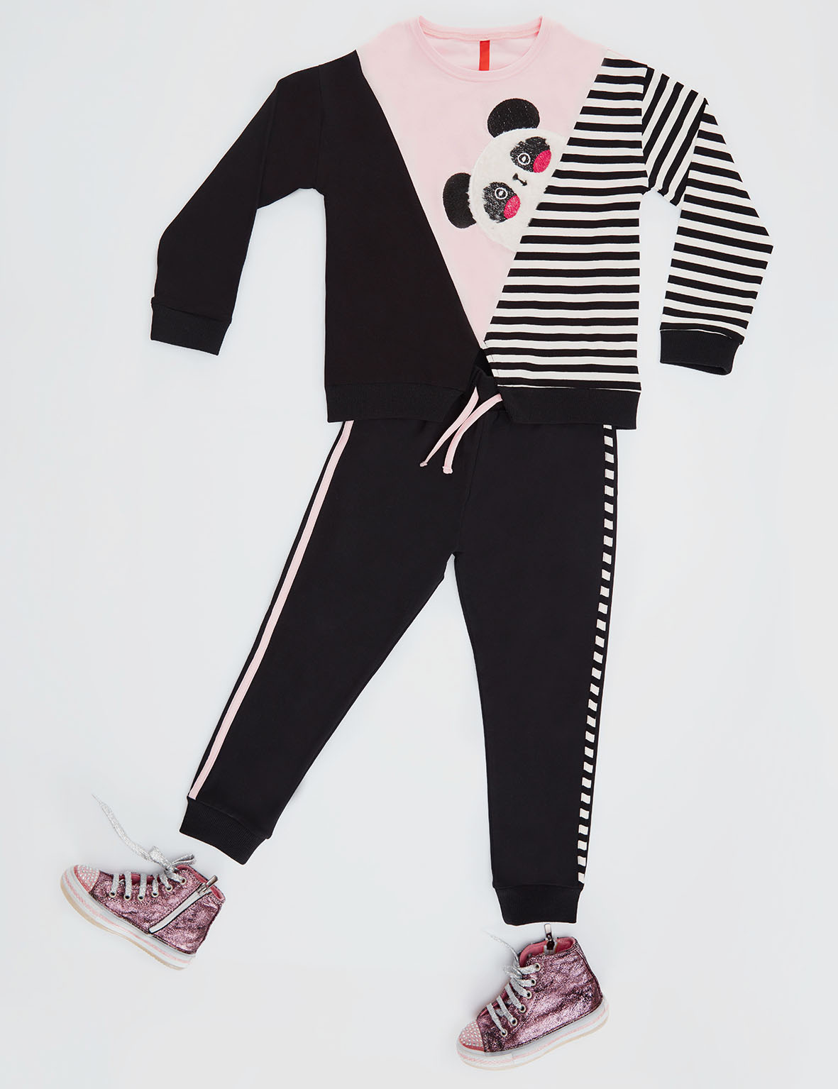 2 piece girl tracksuit. Assymetric cut sweatshirt with 3 different color fabric and a plush panda applique on. The set is combined with a black, cotton sweat-pants with stripes on sides.