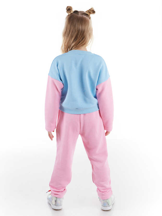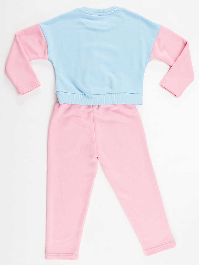 2 piece girl tracksuit. The sweatshirt of the set is designed as crop-top in 2 different cotton terry fabric color. It has a print and a 3D plush unicorn on. The plush is attached to the fabric with velcro. Can be removed before washing. Th
