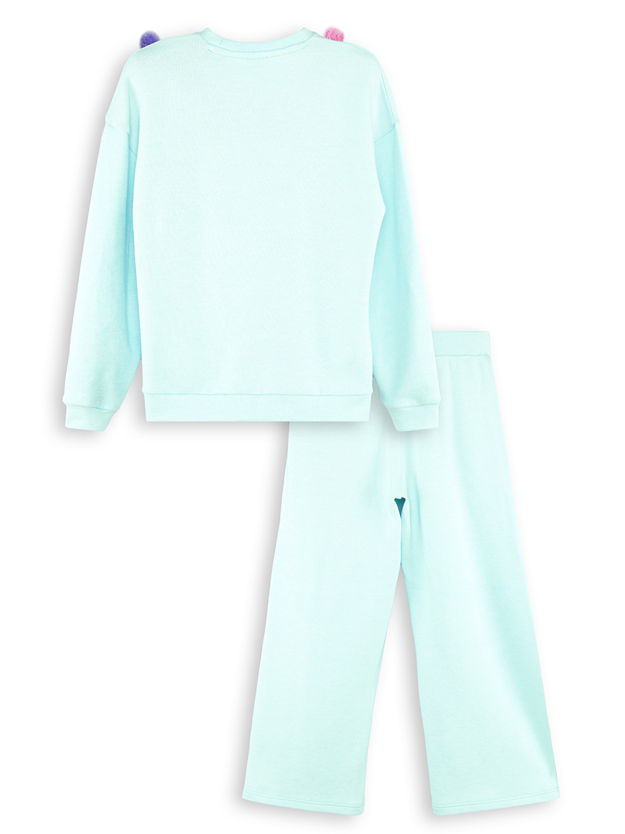 2-piece tracksuit. Made of knit fabric, it features long sleeves and a crew neck. It has handcrafted pom-poms. It should be washed carefully and delicately. The pants are wide-leg and have an elasticated waist. All Denokids products are pro