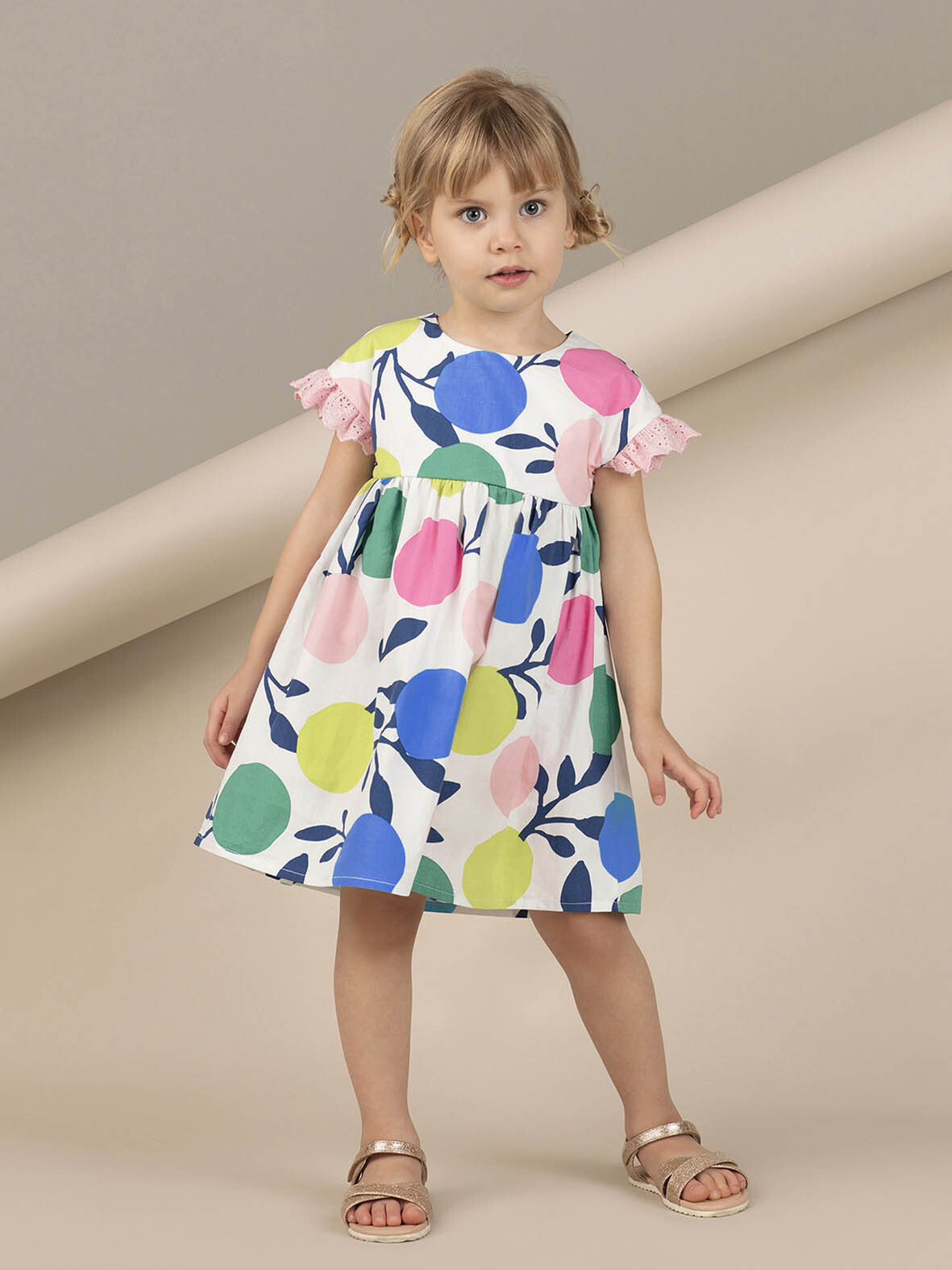 Pamuklu, poplin dokuma kumaştan kız çocuk elbise. Kol ağızlarına fırfır verilerek dikilen fisto sayesinde romantik bir hava sağlanmıştır. Altına astar dikilerek elbisenin üstte duruşuna zengin bir hava kazandırılmıştır. %100 Pamuk