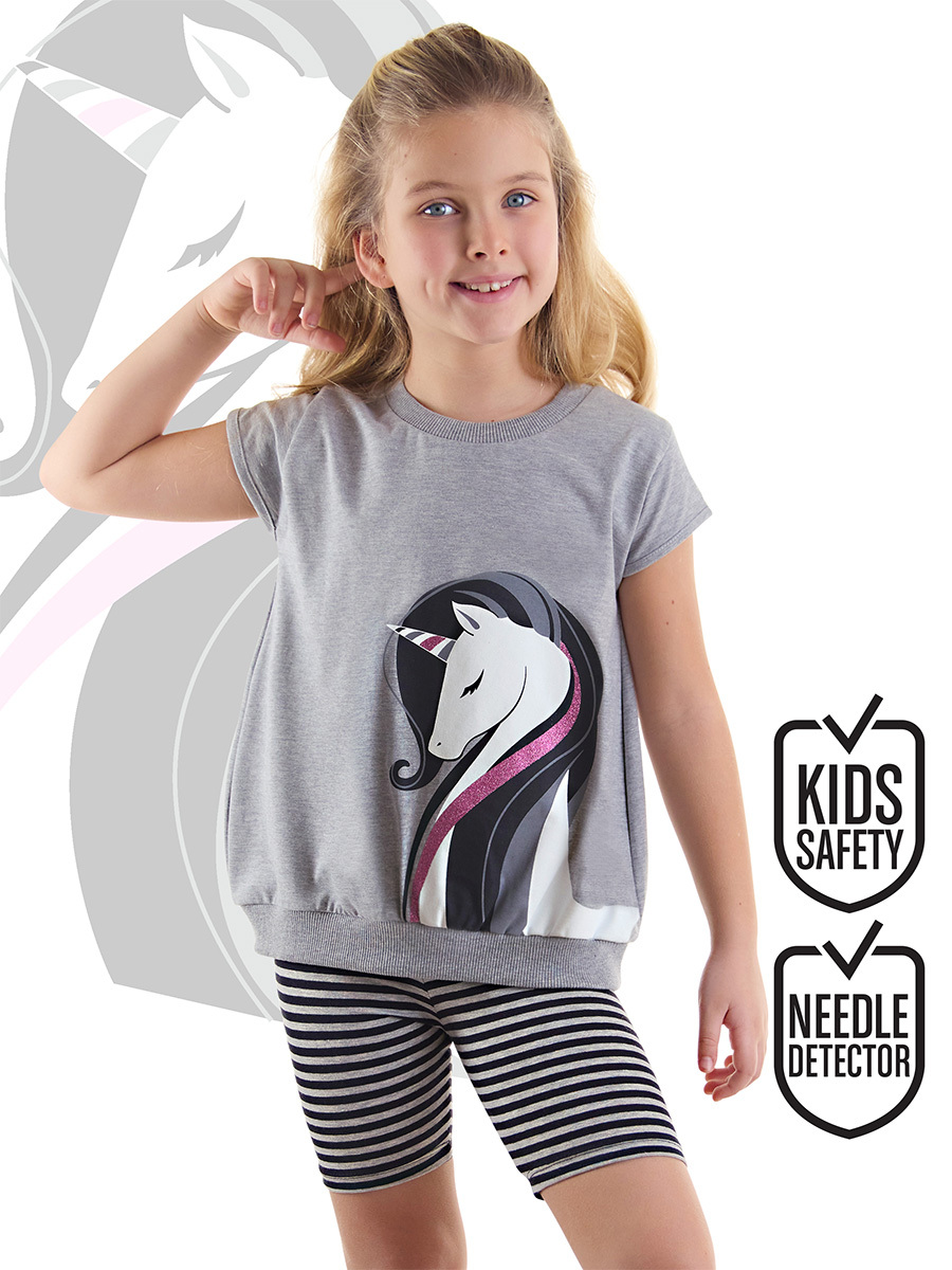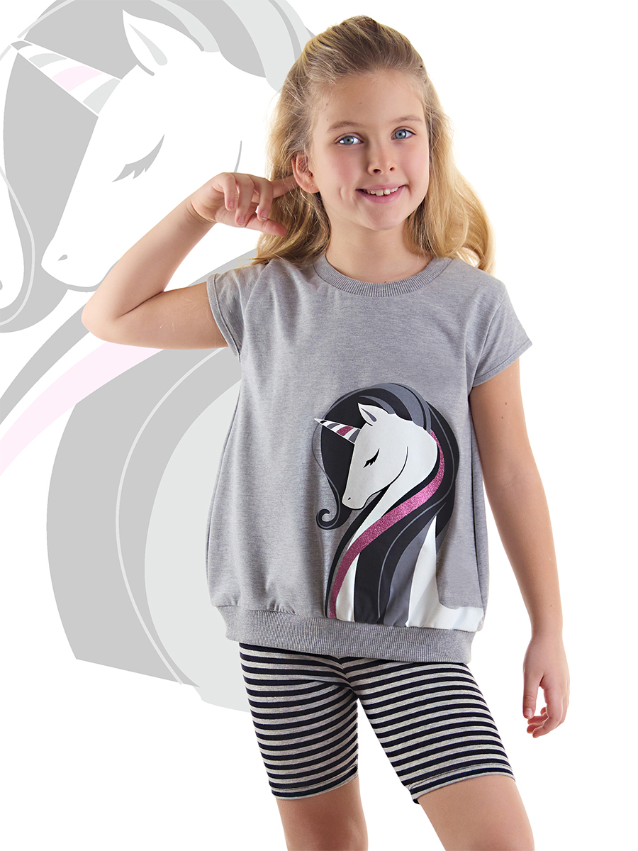 2 piece set. Cotton jersey, tunic size t-shirt. An elegent unicorn print on. Black&Grey striped leggings is made of elastic, Cotton Jersey. All Denokids Products are manufactured within the Kids Safety Guideline. Has been inspected by metal