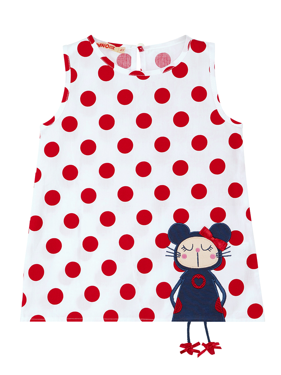 2'li takım. Puantiyeli dokuma kumaştan, etek ucu aplike desenli, desenin bacakları mobil tunik takım. Üst: %100 Pamuk, Alt: %96 Pamuk %4 Elastan