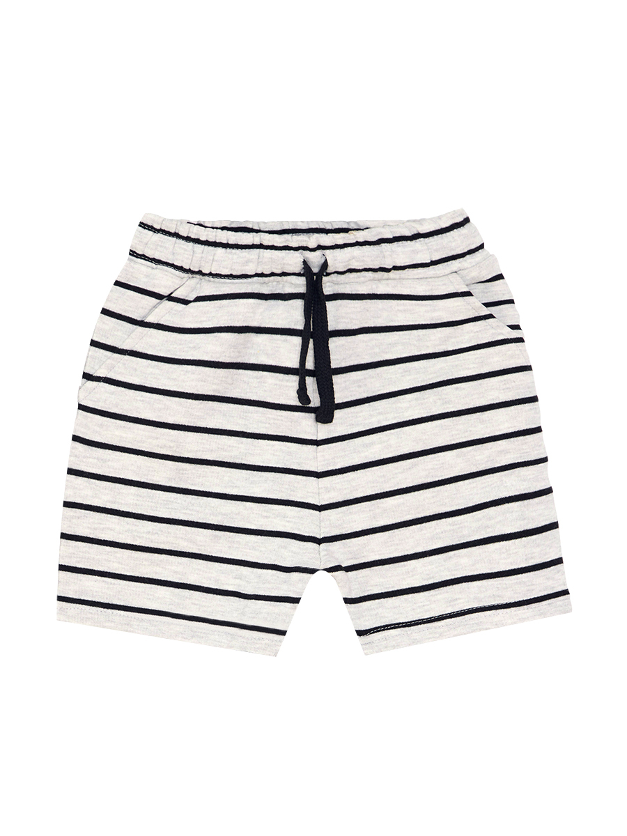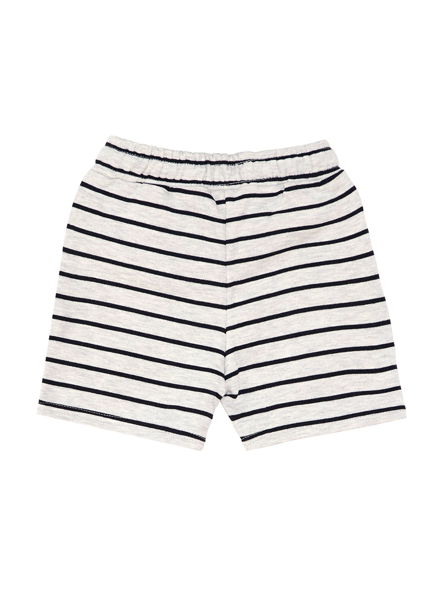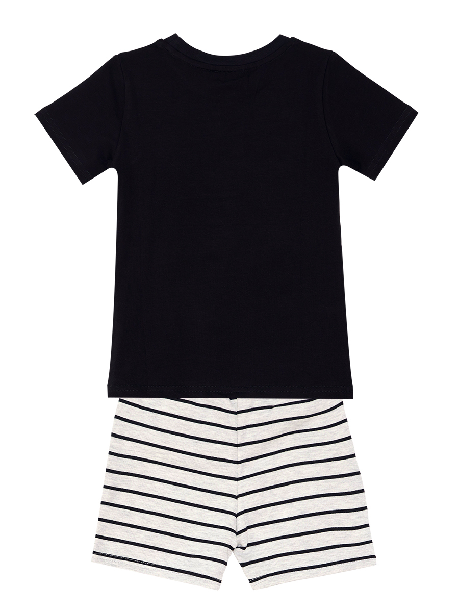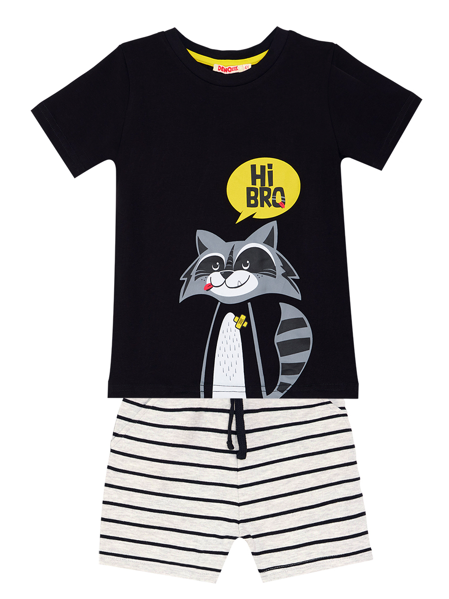 2 piece boy set. Cotton jersey t-shirt with a raccoon print on. The shorts is made of striped French Terry and has elastic waist and strings. All Denokids Products are manufactured within the Kids Safety Guideline. Has been inspected by met