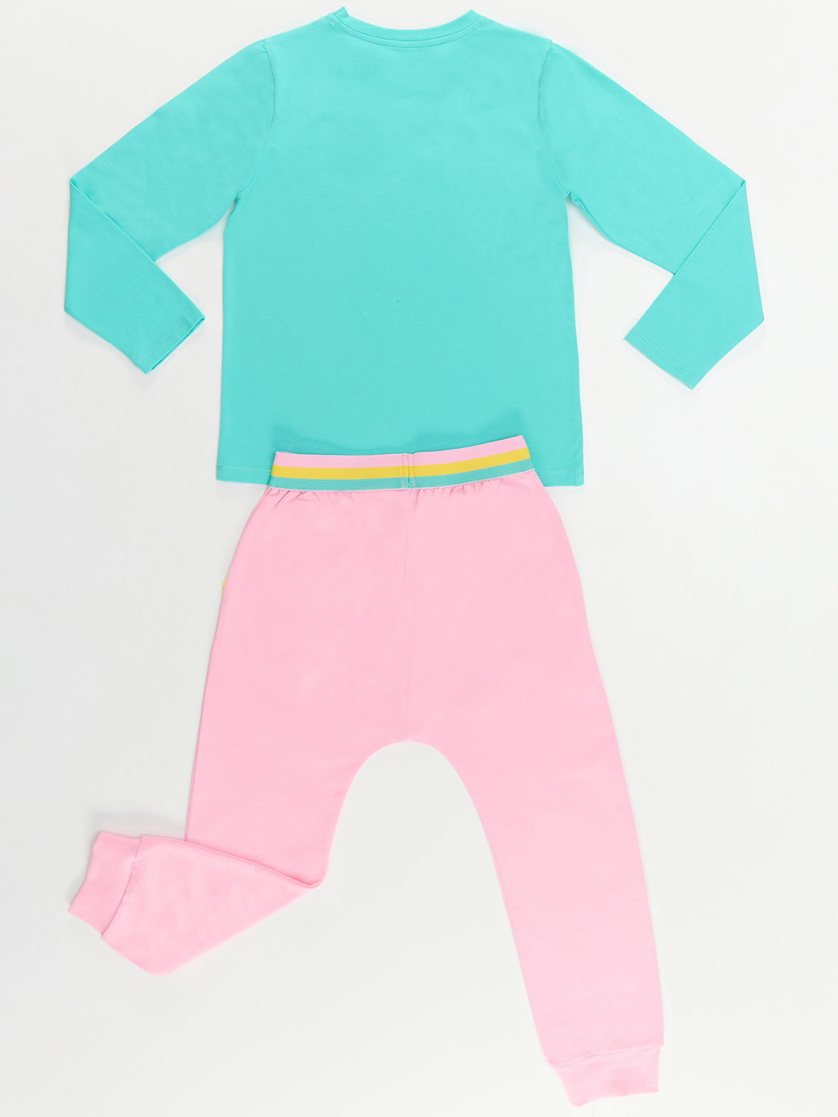 2 piece set. Tee made of cotton jersey. Has a unicorn print on. The set is completed with harem style, baggy, cotton pants. Has 2 side pockets. A colorful, striped elastic bant on waist. All Denokids products are produced with kids safety g