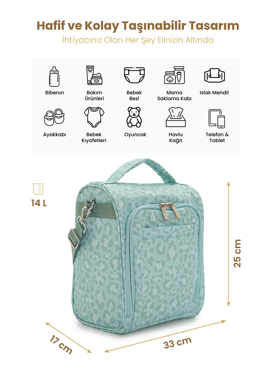 Detaylar • Boyutlar – 33 cm G × 25 cm Y × 17 cm D • Ana Bölme – Fermuarlı ana bölme ile eşyalarınız düzenli ve güvenli bir şekilde saklanır • Ön Cep – Fermuarlı ön cep, hızlı erişim için ideal • Taşıma – Elde taşıma sapı sayesinde kolay kullanım • Askılar – Ayarlanabilir ve çıkarılabilir çapraz askı, omuz veya çapraz kullanım olanağı sunar • Bebek Arabasına Takılan Askı – Bebek arabasına kolayca takılabilen tasarımıyla pratik kullanım olanağı sağlar • Kumaş – Antibakteriyel astar, hijyenik ve sağlıklı kullanım sağlar • Ekstralar – Hafif ve kompakt tasarımıyla günlük kullanım ve seyahat için uygundur Özellikler • Antibakteriyel astar, bebek bakım ürünlerinin hijyenini korur • Fermuarlı ana bölme ve ön cep ile eşyalar düzenli ve güvenli • Ayarlanabilir ve çıkarılabilir çapraz askı sayesinde farklı taşıma seçenekleri • Elde taşıma sapı, hızlı ve pratik kullanım imkânı sunar • Hafif yapısı sayesinde uzun süreli taşımalarda konfor sağlar • ASTM antibakteriyel testi ile onaylanmış, 24 saatte %99 bakteri azalımı sağlar Ürün Hikayesi SnapPack, anneler için tasarlanmış, işlevsellik ve şıklığı bir araya getiren özel bir çantadır. Kompakt ve hafif yapısıyla günlük yaşamda rahat kullanım sunar. Fermuarlı ana bölme ve ön cepler, bebek bakım ürünlerini düzenli şekilde saklamayı sağlar. Antibakteriyel astarı sayesinde hijyenik bir ortam oluşturur, ebeveynlerin içi rahat eder. Ayarlanabilir ve çıkarılabilir çapraz askısı ile çantayı omuzda veya çapraz şekilde taşıyabilir, elde sapını kullanarak hızlı erişim sağlayabilirsiniz. SnapPack, hem fonksiyonel hem de modern tasarımıyla annelerin vazgeçilmez tamamlayıcısıdır. %100 polyester